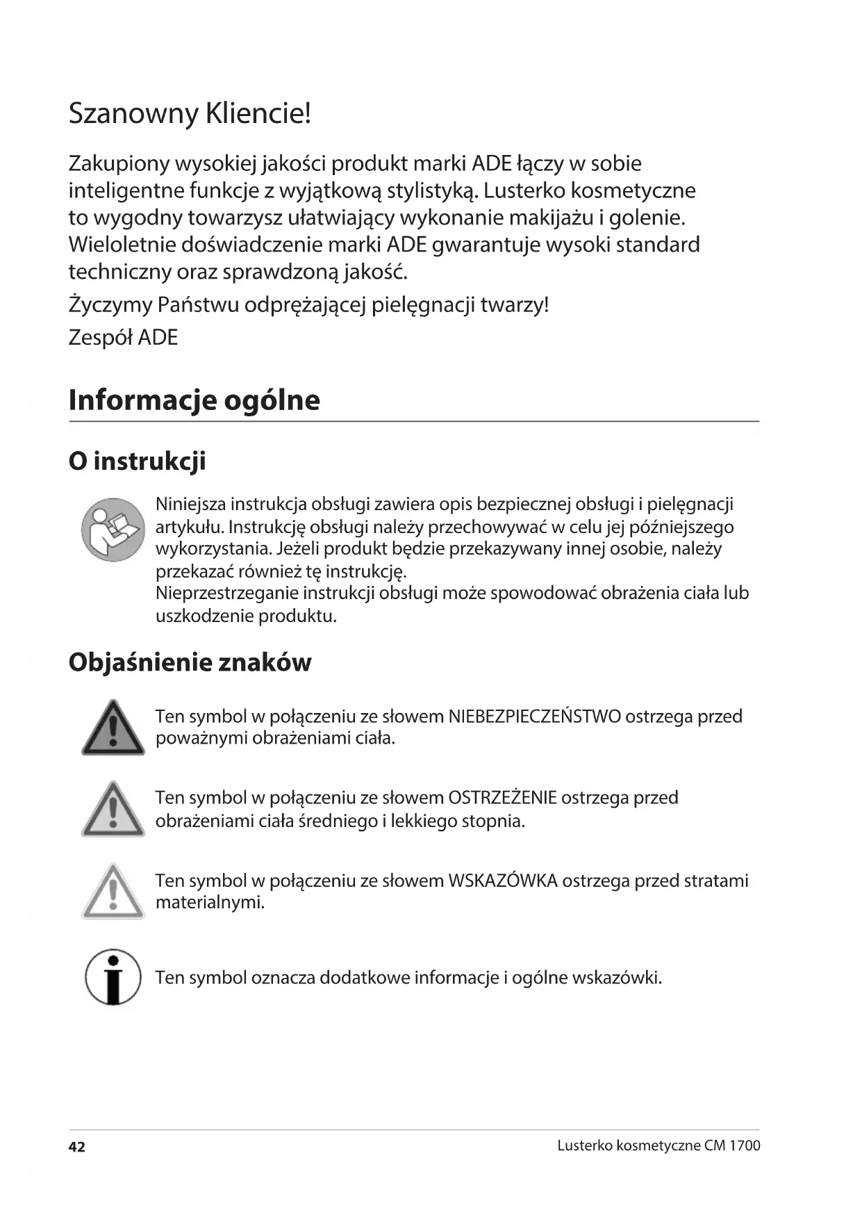 Lusterko kosmetyczne CM 1700 Szanowny Kliencie! Zakupiony wysokiej jakości produkt marki ADE łączy w sobie inteligentne funkcje z wyjątkową stylistyką. Lusterko kosmetyczne to wygodny towarzysz ułatwiający wykonanie makijażu i golenie. Wieloletnie doświadczenie marki ADE gwarantuje wysoki standard techniczny oraz sprawdzoną jakość. Życzymy Państwu odprężającej pielęgnacji twarzy! Zespół ADE Informacje ogólne O instrukcji Niniejsza instrukcja obsługi zawiera opis bezpiecznej obsługi i pielęgnacji artykułu. Instrukcję obsługi należy przechowywać w celu jej późniejszego wykorzystania. Jeżeli produkt będzie przekazywany innej osobie, należy przekazać również tę instrukcję. Nieprzestrzeganie instrukcji obsługi może spowodować obrażenia ciała lub uszkodzenie produktu. Objaśnienie znaków Ten symbol w połączeniu ze słowem NIEBEZPIECZEŃSTWO ostrzega przed poważnymi obrażeniami ciała. Ten symbol w połączeniu ze słowem OSTRZEŻENIE ostrzega przed obrażeniami ciała średniego i lekkiego stopnia. Ten symbol w połączeniu ze słowem WSKAZÓWKA ostrzega przed stratami materialnymi. Ten symbol oznacza dodatkowe informacje i ogólne wskazówki. Druckbuch Kosmetikspiegel CM 1700.indb 42 13.11.2017 13:54:28Spis treści