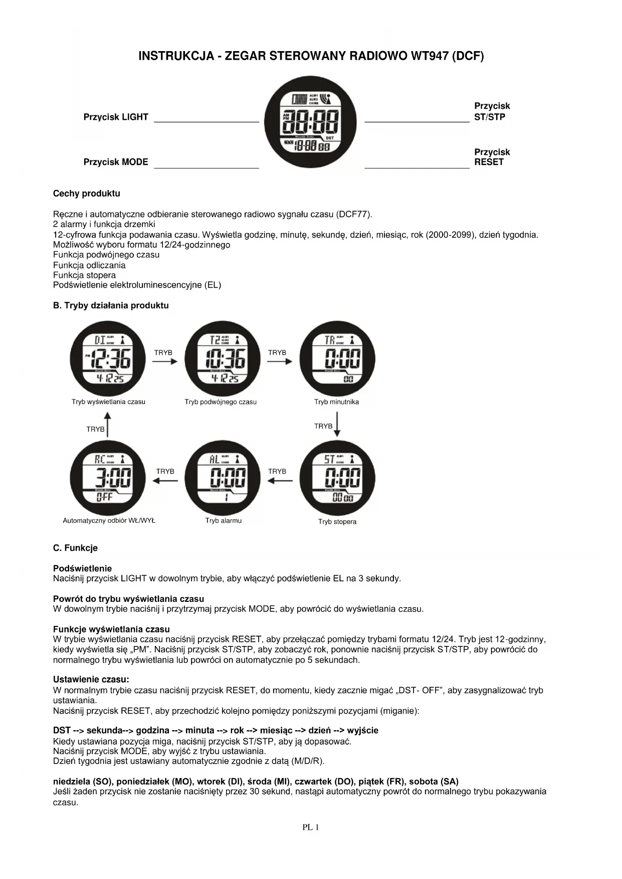 Aby przyjecć do trybu podwójné czasu, naciśnj i przytrzymaj przycisk RESET do momentu, kiedy zacznie migac „godzina“, aby przyjecć do trybu ustawién. Naciśnj przycisk ST/STP, aby dopasowej migacja wartość. W podwojnym czasie sąstymi ustawic tylko godzine. Minuta i sekunda zostana automatycznie zsychronizowej z normalnym czasem. Naciśnj przycisk MODE, aby wyjsć ztrybu ustawiania.