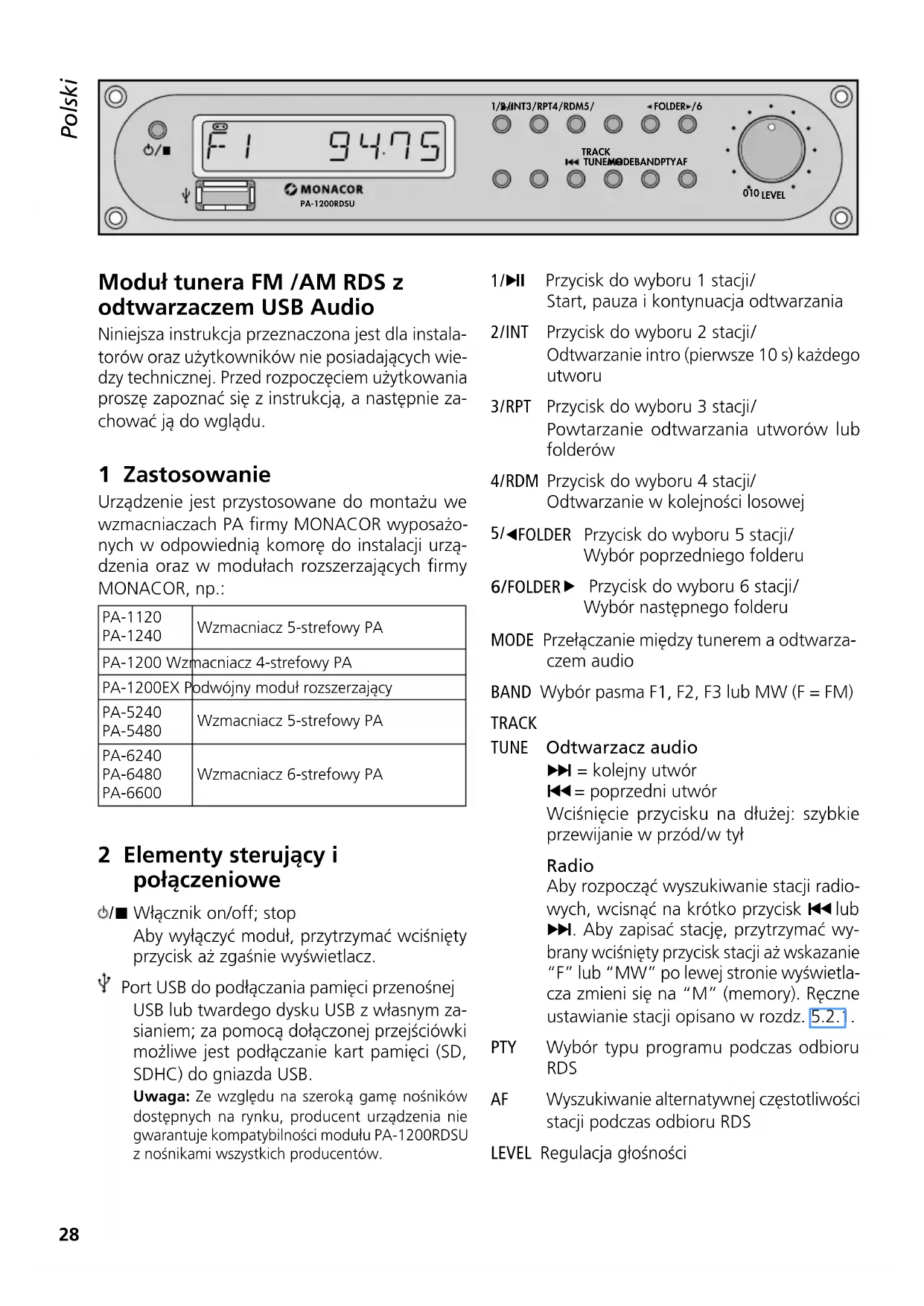 FM: 3 × 6 AM: 1 × 6 Sensibilidad RF/ relación S/N: FM: 6 dBµV/ > 60 dB AM: 30 dBµV/ > 35 dB THD: < 0,5 % (para FM) Alimentación DC: 17 V, 250 mA mediante amplificador de megafonía o aparato complementario Dimensiones: 195 × 40 × 96 mm Peso: 260 g Sujeto a modificaciones técnicas. Manual de instrucciones protegido por el copyright de MONACOR INTERNATIONAL GmbH & Co. KG. Toda reproducción mismo parcial para fines comerciales está prohibida.28 Polski Deutsch Deutsch Seite English English Page Français Français Page Italiano Italiano Pagina Español Español Página Nederlands Nederlands Pagina TRACKTUNEMODE BAND PTY AF0 10LEVEL1/ 2/INT 3/RPT 4/RDM 5/FOLDER PA-1200RDSU Polski Polski Strona Moduł tunera FM /AM RDS z odtwarzaczem USB Audio Niniejsza instrukcja przeznaczona jest dla instala- torów oraz użytkowników nie posiadających wie- dzy technicznej. Przed rozpoczęciem użytkowania proszę zapoznać się z instrukcją, a następnie za- chować ją do wglądu. 1 Zastosowanie Urządzenie jest przystosowane do montażu we wzmacniaczach PA firmy MONACOR wyposażo- nych w odpowiednią komorę do instalacji urzą- dzenia oraz w modułach rozszerzających firmy MONACOR, np.: PA-1120 PA-1240Wzmacniacz 5-strefowy PAPA-1200 Wzmacniacz 4-strefowy PAPA-1200EX Podwójny moduł rozszerzającyPA-5240 PA-5480Wzmacniacz 5-strefowy PAPA-6240 PA-6480 PA-6600Wzmacniacz 6-strefowy PA 2 Elementy sterujący i połączeniowe / Włącznik on/off; stop Aby wyłączyć moduł, przytrzymać wciśnięty przycisk aż zgaśnie wyświetlacz. Port USB do podłączania pamięci przenośnej USB lub twardego dysku USB z własnym za- sianiem; za pomocą dołączonej przejściówki możliwe jest podłączanie kart pamięci (SD, SDHC) do gniazda USB. Uwaga: Ze względu na szeroką gamę nośników dostępnych na rynku, producent urządzenia nie gwarantuje kompatybilności modułu PA-1200RDSU z nośnikami wszystkich producentów. 1 /