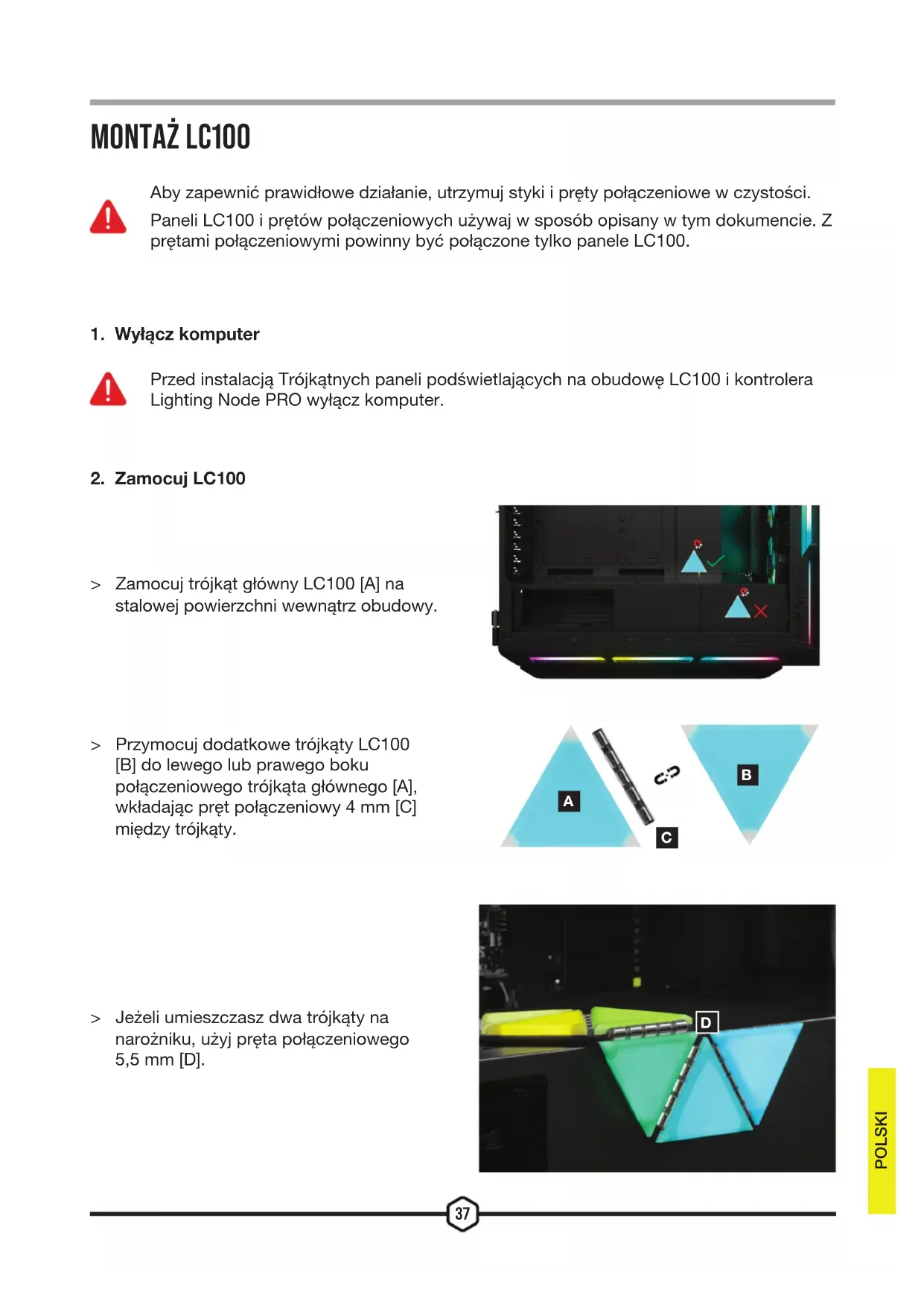 MONTAŻ LC100 Przed instalacją Trójkątnych paneli podświetlających na obudowę LC100 i kontrolera Lighting Node PRO wyłącz komputer. > Zamocuj trójkąt główny LC100 [A] na stalowej powierzchni wewnątrz obudowy. > Przymocuj dodatkowe trójkąty LC100 [B] do lewego lub prawego boku połączeniowego trójkąta głównego [A], wkładając pręt połączeniowy 4mm [C] między trójkąty. > Jeżeli umieszczasz dwa trójkąty na narożniku, użyj pręta połączeniowego 5,5mm [D]. POLSKI Aby zapewnić prawidłowe działanie, utrzymuj styki i pręty połączeniowe w czystości. Paneli LC100 i prętów połączeniowych używaj w sposób opisany w tym dokumencie. Z prętami połączeniowymi powinny być połączone tylko panele LC100.38 A A