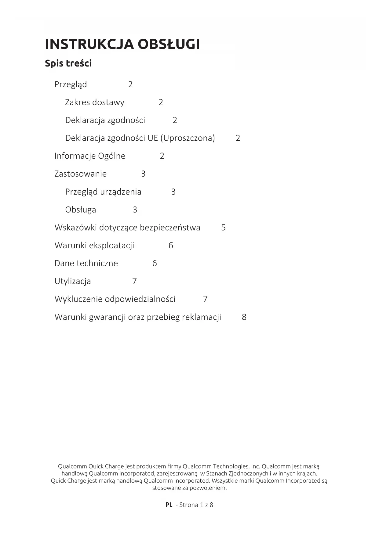INTENSO INTERNATIONAL GMBH I Service Center (Vaš RMA broj) Kopernikusstraße 12-14 I D-49377 VechtaINSTRUKCJA OBSŁUGI PL - Strona 1 z 8 Spis treści Przegląd 2 Zakresdostawy 2 Deklaracjazgodności 2 DeklaracjazgodnościUE(Uproszczona) 2 InformacjeOgólne 2 Zastosowanie 3 Przeglądurządzenia 3 Obsługa 3 Wskazówkidotyczącebezpieczeństwa 5 Warunkieksploatacji 6 Danetechniczne 6 Utylizacja 7 Wykluczenieodpowiedzialności 7 Warunkigwarancjiorazprzebiegreklamacji 8 Qualcomm Quick Charge jest produktem rmy Qualcomm Technologies, Inc. Qualcomm jest marką handlową Qualcomm Incorporated, zarejestrowaną w Stanach Zjednoczonych i w innych krajach. Quick Charge jest marką handlową Qualcomm Incorporated. Wszystkie marki Qualcomm Incorporated są stosowane za pozwoleniem.PL -Strona2z8