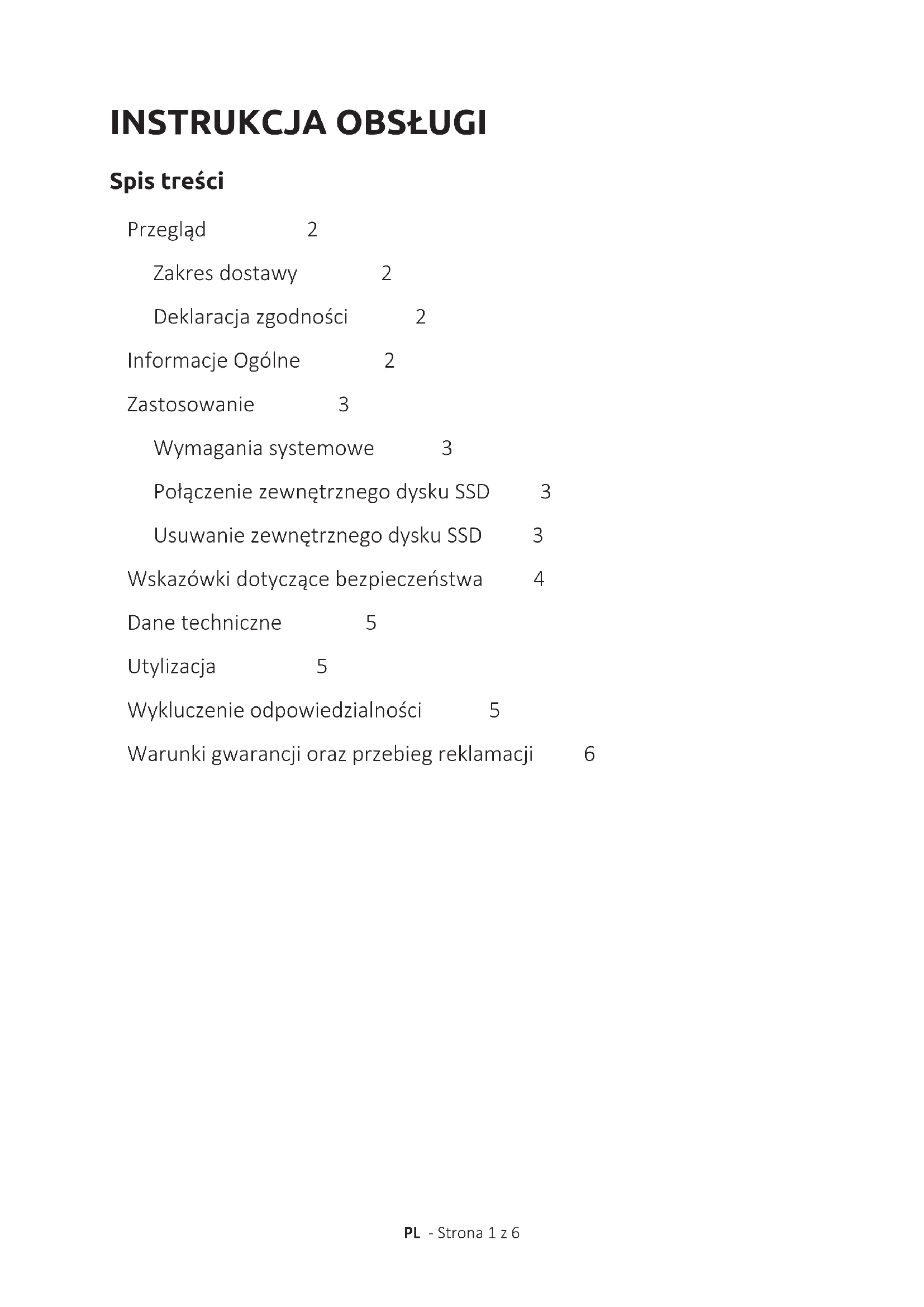 Deklaracja zgodności OznaczenieCEpotwierdza,żetenwyróbspełniawymaganiawszystkich obowiązującychdlategowyrobudyrektywUE. Zakres dostawy PRZEGLĄD ZewnętrznydyskSSDprzeznaczonyjestgłówniedoprzechowywaniadanychzkomputerów, notebooków,ultrabookówlubkomputerówMAC.Produkttenniejestprzewidzianydoużytku komercyjnego,anidozastosowańmedycznychispecjalnych,wktórychawariaproduktumoże doprowadzićdoobrażeńciała,śmiertelnychwypadków,lubznacznychszkódmaterialnych. Odpowiedzialnośćwygasawprzypadkuużytkowanianiezgodnegozprzeznaczeniem.Należy zaniechaćotwieraniaorazprzeróbekurządzenia,atakżeużywaniaurządzeńdodatkowychi akcesoriów,któreniezostałyprzeznaszatwierdzone.NieużywaćzewnętrznegodyskuSSDw ekstremalnychwarunkachotoczeniaistosowaćsiędowskazówekdotyczącychbezpieczeństwa. Nieprzestrzeganieinformacjiiwskazówekdotyczącychbezpieczeństwazawartychwniniejszej instrukcjitraktowanejestjakonieprzestrzeganiezasadużytkowaniazgodnegozprzeznaczeniem, prowadzidowygaśnięciaodpowiedzialnościimożedoprowadzićdoszkódnazdrowiuiżyciuosób lubszkódmaterialnych. Użytkowanie zgodnie z przeznaczeniem