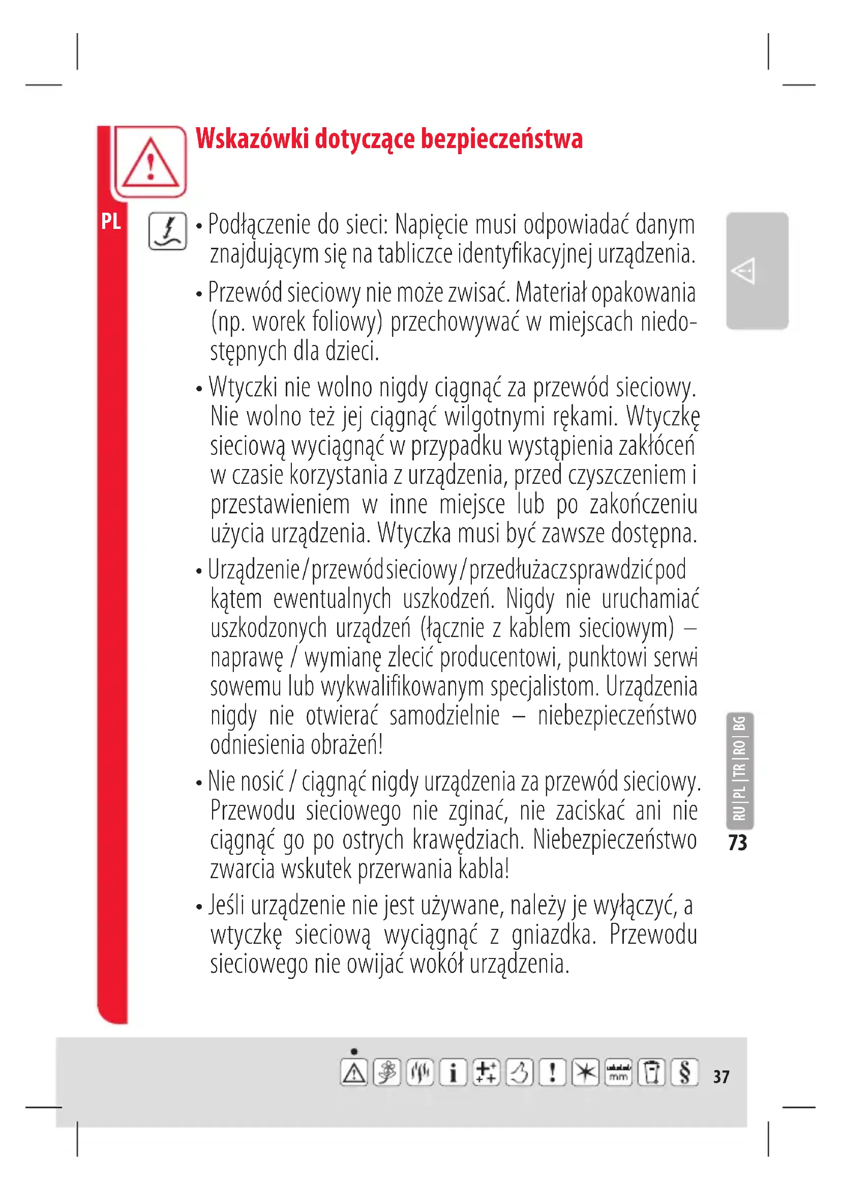 - Nie nosić / ciągnąć nigdy urządzenia za przewód sieciowy. Przewodu sieciowego nie zginać, nie zaciskać ani nie ciągnąć go po ostrych krawędziach. Niebezpieczeństwo zwarcia wskutek przerwania kabla!