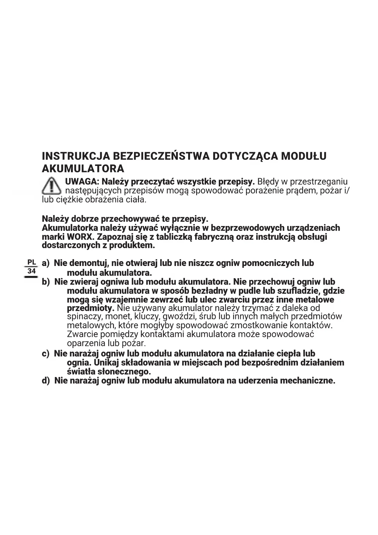 b) Nie zwieraj ogniwa lub moduł akumulatora. Nie przechowuj ogniw lub moduł akumulatora w sposob bezędny w pudle lub szufladzie, gdzie mogą są wzajemnie zewrzej lub ulec zwarciu przyez年内 metalowe przyedmiotiy. Nie uzywany akumulator naleź trzymać z daleka od spinaczy, monet, kluczzy, gwoździ, szrub lub innych małych przyedmiotów metalowych, króre mogłyby spowodowej zmostkownikie kontaków. Zwarcie pomiedź kontaktami akumulatora są wy spośwodowej oparzenia lub pożar.