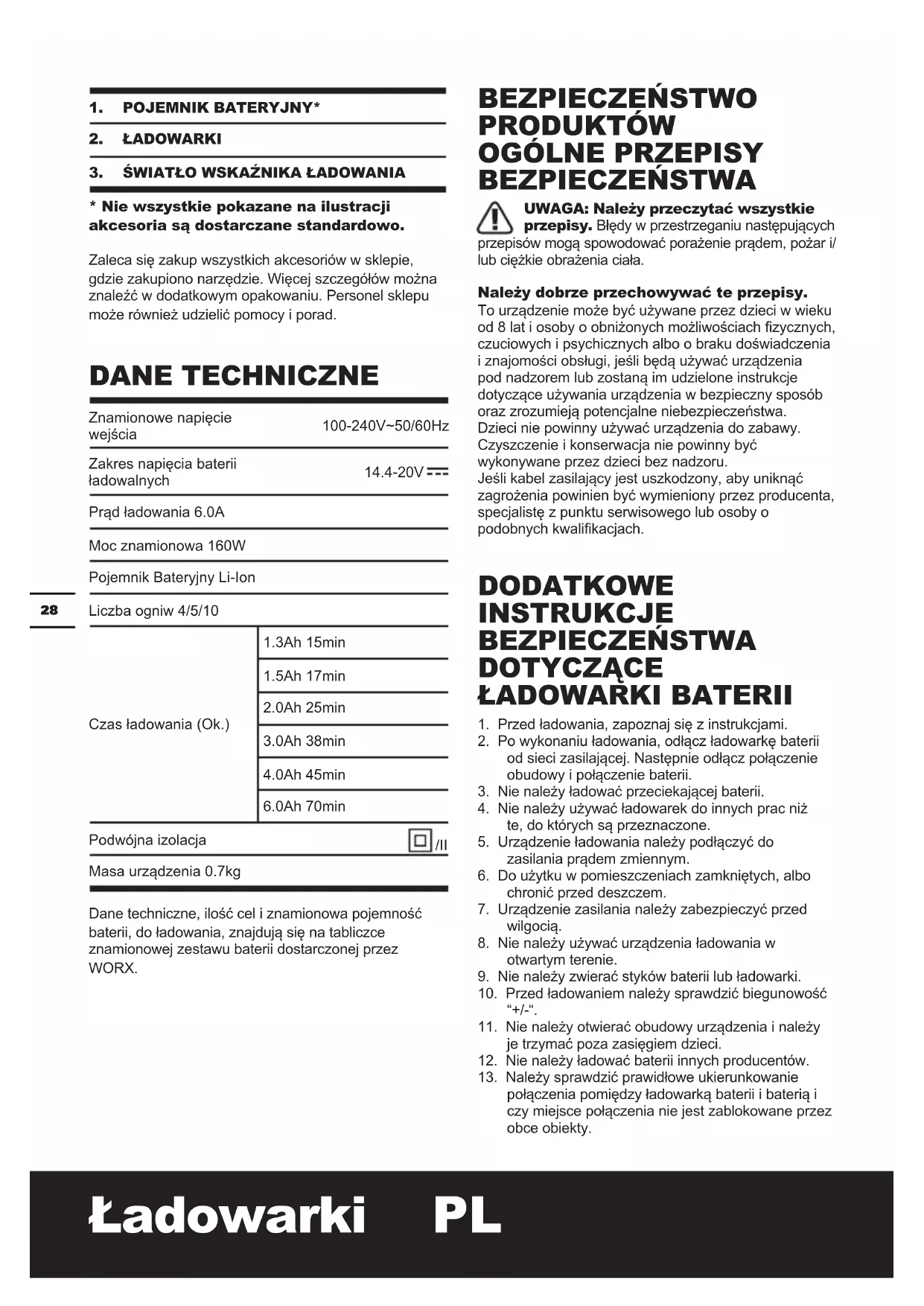 *Niewszystkiepokazanenailustracji akcesoriasądostarczanestandardowo. Zaleca się zakup wszystkich akcesoriów w sklepie, gdzie zakupiono narzędzie. Więcej szczegółów można znaleźć w dodatkowym opakowaniu. Personel sklepu może również udzielić pomocy i porad. DANETECHNICZNE Znamionowe napięcie wejścia 100-240V~50/60Hz Zakres napięcia baterii ładowalnych 14.4-20V Prąd ładowania 6.0A Moc znamionowa 160W Pojemnik Bateryjny Li-Ion Liczba ogniw 4/5/10 Czas ładowania (Ok.) 1.3Ah 15min 1.5Ah 17min 2.0Ah 25min 3.0Ah 38min 4.0Ah 45min 6.0Ah 70min Podwójna izolacja /II Masa urządzenia 0.7kg Dane techniczne, ilość cel i znamionowa pojemność baterii, do ładowania, znajdują się na tabliczce znamionowej zestawu baterii dostarczonej przez WORX. BEZPIECZEŃSTWO PRODUKTÓW OGÓLNEPRZEPISY BEZPIECZEŃSTWA UWAGA:Należyprzeczytaćwszystkie przepisy. Błędy w przestrzeganiu następujących przepisów mogą spowodować porażenie prądem, pożar i/ lub ciężkie obrażenia ciała. Należydobrzeprzechowywaćteprzepisy. To urządzenie może być używane przez dzieci w wieku od 8 lat i osoby o obniżonych możliwościach zycznych, czuciowych i psychicznych albo o braku doświadczenia i znajomości obsługi, jeśli będą używać urządzenia pod nadzorem lub zostaną im udzielone instrukcje dotyczące używania urządzenia w bezpieczny sposób oraz zrozumieją potencjalne niebezpieczeństwa. Dzieci nie powinny używać urządzenia do zabawy. Czyszczenie i konserwacja nie powinny być wykonywane przez dzieci bez nadzoru. Jeśli kabel zasilający jest uszkodzony, aby uniknąć zagrożenia powinien być wymieniony przez producenta, specjalistę z punktu serwisowego lub osoby o podobnych kwalikacjach. DODATKOWE INSTRUKCJE BEZPIECZEŃSTWA DOTYCZĄCE ŁADOWARKIBATERII