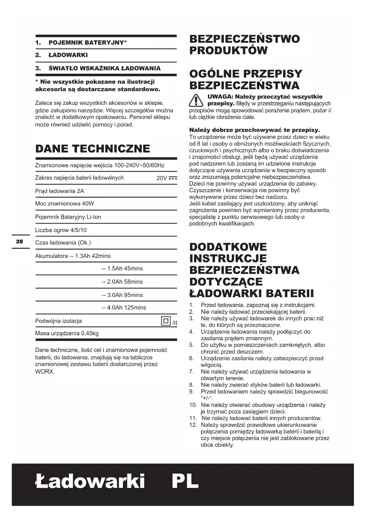 *Niewszystkiepokazanenailustracji akcesoriasądostarczanestandardowo. Zaleca się zakup wszystkich akcesoriów w sklepie, gdzie zakupiono narzędzie. Więcej szczegółów można znaleźć w dodatkowym opakowaniu. Personel sklepu może również udzielić pomocy i porad. DANETECHNICZNE Znamionowe napięcie wejścia 100-240V~50/60Hz Zakres napięcia baterii ładowalnych 20V Prąd ładowania 2A Moc znamionowa 40W Pojemnik Bateryjny Li-Ion Liczba ogniw 4/5/10 Czas ładowania (Ok.) Akumulatora -- 1.3Ah 42mins -- 1.5Ah 45mins -- 2.0Ah 58mins -- 3.0Ah 95mins -- 4.0Ah 125mins Podwójna izolacja /II Masa urządzenia 0.45kg Dane techniczne, ilość cel i znamionowa pojemność baterii, do ładowania, znajdują się na tabliczce znamionowej zestawu baterii dostarczonej przez WORX. BEZPIECZEŃSTWO PRODUKTÓW OGÓLNEPRZEPISY BEZPIECZEŃSTWA UWAGA:Należyprzeczytaćwszystkie przepisy. Błędy w przestrzeganiu następujących przepisów mogą spowodować porażenie prądem, pożar i/ lub ciężkie obrażenia ciała. Należydobrzeprzechowywaćteprzepisy. To urządzenie może być używane przez dzieci w wieku od 8 lat i osoby o obniżonych możliwościach zycznych, czuciowych i psychicznych albo o braku doświadczenia i znajomości obsługi, jeśli będą używać urządzenia pod nadzorem lub zostaną im udzielone instrukcje dotyczące używania urządzenia w bezpieczny sposób oraz zrozumieją potencjalne niebezpieczeństwa. Dzieci nie powinny używać urządzenia do zabawy. Czyszczenie i konserwacja nie powinny być wykonywane przez dzieci bez nadzoru. Jeśli kabel zasilający jest uszkodzony, aby uniknąć zagrożenia powinien być wymieniony przez producenta, specjalistę z punktu serwisowego lub osoby o podobnych kwalikacjach. DODATKOWE INSTRUKCJE BEZPIECZEŃSTWA DOTYCZĄCE ŁADOWARKIBATERII
