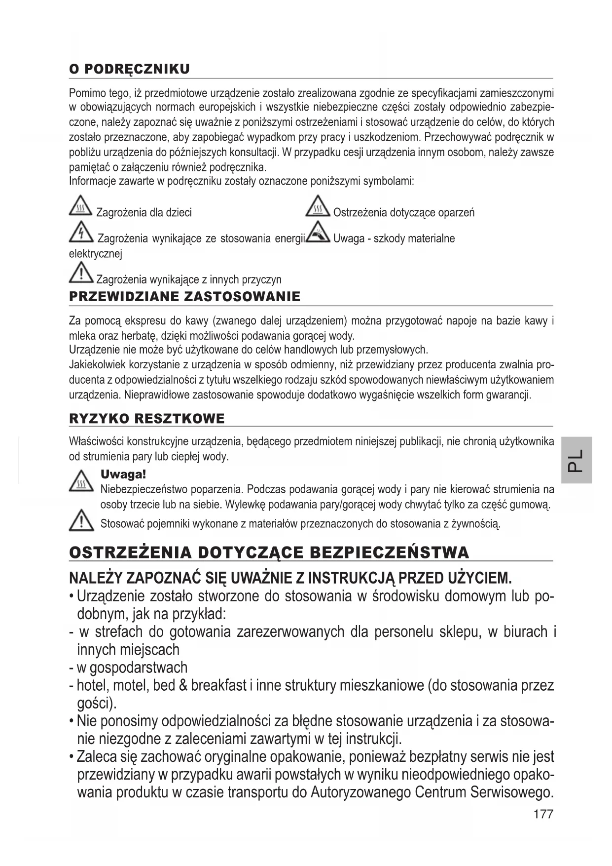 232'5Č&=1,.8 Pomimo tego, iĪ przedmiotowe urządzenie zostaáo zrealizowana zgodnie ze specy¿kacjami zamieszczonymi w obowiązujących normach europejskich i wszystkie niebezpieczne czĊĞci zostaáy odpowiednio zabezpie- czone, naleĪy zapoznaü siĊ uwaĪnie z poniĪszymi ostrzeĪeniami i stosowaü urządzenie do celów, do których zostaáo przeznaczone, aby zapobiegaü wypadkom przy pracy i uszkodzeniom. Przechowywaü podrĊcznik w pobliĪu urządzenia do póĨniejszych konsultacji. W przypadku cesji urządzenia innym osobom, naleĪy zawsze pamiĊtaü o zaáączeniu równieĪ podrĊcznika. Informacje zawarte w podrĊczniku zostaáy oznaczone poniĪszymi symbolami: ZagroĪenia dla dzieci OstrzeĪenia dotyczące oparzeĔ ZagroĪenia wynikające ze stosowania energii elektrycznej Uwaga - szkody materialne ZagroĪenia wynikające z innych przyczyn 35=(:,'=,$1(=$67262:$1,( Za pomocą ekspresu do kawy (zwanego dalej urządzeniem) moĪna przygotowaü napoje na bazie kawy i mleka oraz herbatĊ, dziĊki moĪliwoĞci podawania gorącej wody. Urządzenie nie moĪe byü uĪytkowane do celów handlowych lub przemysáowych. Jakiekolwiek korzystanie z urządzenia w sposób odmienny, niĪ przewidziany przez producenta zwalnia pro- ducenta z odpowiedzialnoĞci z tytuáu wszelkiego rodzaju szkód spowodowanych niewáaĞciwym uĪytkowaniem urządzenia. Nieprawidáowe zastosowanie spowoduje dodatkowo wygaĞniĊcie wszelkich form gwarancji. 5<=<.25(6=7.2:( WáaĞciwoĞci konstrukcyjne urządzenia, bĊdącego przedmiotem niniejszej publikacji, nie chronią uĪytkownika od strumienia pary lub ciepáej wody. 8ZDJD NiebezpieczeĔstwo poparzenia. Podczas podawania gorącej wody i pary nie kierowaü strumienia na osoby trzecie lub na siebie. WylewkĊ podawania pary/gorącej wody chwytaü tylko za czĊĞü gumową. Stosowaü pojemniki wykonane z materiaáów przeznaczonych do stosowania z ĪywnoĞcią. 2675=(į(1,$'27<&=ć&(%(=3,(&=(Ę67:$ NALEĪY ZAPOZNAü SIĊ U:AĪNIE Z INSTRUKC-ą PRZED UĪYCIEM. Urządzenie zostaáo stworzone do stosowania w Ğrodowisku domowym lub po- dobnym, jak na przykáad: - w strefach do gotowania zarezerwowanych dla personelu sklepu, w biurach i innych miejscach - w gospodarstwach - hotel, motel, bed & breakfast i inne struktury mieszkaniowe (do stosowania przez goĞci). Nie ponosimy odpowiedzialnoĞci za báĊdne stosowanie urządzenia i za stosowa- nie niezgodne z zaleceniami zawartymi w tej instrukcji. Zaleca siĊ zachowaü oryginalne opakowanie, poniewaĪ bezpáatny serwis nie jest przewidziany w przypadku awarii powstaáych w wyniku nieodpowiedniego opako- wania produktu w czasie transportu do Autoryzowanego Centrum Serwisowego.178