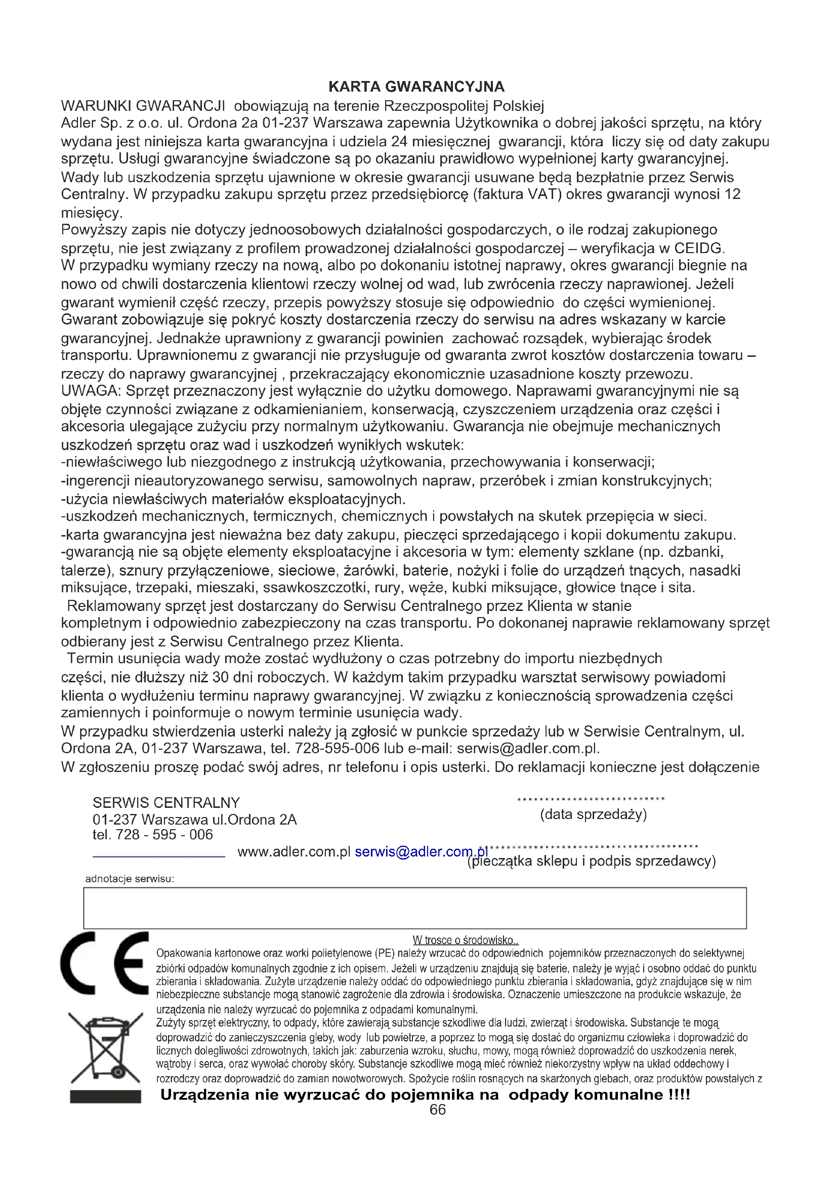 ТЕХНИЧЕСКИЕ ДАННЫЕ Напряжение: 220-240 В~ 50 Гц Мощность: 1800-2000 Вт66 KARTA GWARANCYJNA WARUNKI GWARANCJI obowiązują na terenie Rzeczpospolitej Polskiej Adler Sp. z o.o. ul. Ordona 2a 01-237 Warszawa zapewnia Użytkownika o dobrej jakości sprzętu, na który wydana jest niniejsza karta gwarancyjna i udziela 24 miesięcznej gwarancji, która liczy się od daty zakupu sprzętu. Usługi gwarancyjne świadczone są po okazaniu prawidłowo wypełnionej karty gwarancyjnej. Wady lub uszkodzenia sprzętu ujawnione w okresie gwarancji usuwane będą bezpłatnie przez Serwis Centralny. W przypadku zakupu sprzętu przez przedsiębiorcę (faktura VAT) okres gwarancji wynosi 12 miesięcy. Powyższy zapis nie dotyczy jednoosobowych działalności gospodarczych, o ile rodzaj zakupionego sprzętu, nie jest związany z profilem prowadzonej działalności gospodarczej – weryfikacja w CEIDG. W przypadku wymiany rzeczy na nową, albo po dokonaniu istotnej naprawy, okres gwarancji biegnie na nowo od chwili dostarczenia klientowi rzeczy wolnej od wad, lub zwrócenia rzeczy naprawionej. Jeżeli gwarant wymienił część rzeczy, przepis powyższy stosuje się odpowiednio do części wymienionej. Gwarant zobowiązuje się pokryć koszty dostarczenia rzeczy do serwisu na adres wskazany w karcie gwarancyjnej. Jednakże uprawniony z gwarancji powinien zachować rozsądek, wybierając środek transportu. Uprawnionemu z gwarancji nie przysługuje od gwaranta zwrot kosztów dostarczenia towaru – rzeczy do naprawy gwarancyjnej , przekraczający ekonomicznie uzasadnione koszty przewozu. UWAGA: Sprzęt przeznaczony jest wyłącznie do użytku domowego. Naprawami gwarancyjnymi nie są objęte czynności związane z odkamienianiem, konserwacją, czyszczeniem urządzenia oraz części i akcesoria ulegające zużyciu przy normalnym użytkowaniu. Gwarancja nie obejmuje mechanicznych uszkodzeń sprzętu oraz wad i uszkodzeń wynikłych wskutek: -niewłaściwego lub niezgodnego z instrukcją użytkowania, przechowywania i konserwacji; -ingerencji nieautoryzowanego serwisu, samowolnych napraw, przeróbek i zmian konstrukcyjnych; -użycia niewłaściwych materiałów eksploatacyjnych. -uszkodzeń mechanicznych, termicznych, chemicznych i powstałych na skutek przepięcia w sieci. -karta gwarancyjna jest nieważna bez daty zakupu, pieczęci sprzedającego i kopii dokumentu zakupu. -gwarancją nie są objęte elementy eksploatacyjne i akcesoria w tym: elementy szklane (np. dzbanki, talerze), sznury przyłączeniowe, sieciowe, żarówki, baterie, nożyki i folie do urządzeń tnących, nasadki miksujące, trzepaki, mieszaki, ssawkoszczotki, rury, węże, kubki miksujące, głowice tnące i sita. Reklamowany sprzęt jest dostarczany do Serwisu Centralnego przez Klienta w stanie kompletnym i odpowiednio zabezpieczony na czas transportu. Po dokonanej naprawie reklamowany sprzęt odbierany jest z Serwisu Centralnego przez Klienta. Termin usunięcia wady może zostać wydłużony o czas potrzebny do importu niezbędnych części, nie dłuższy niż 30 dni roboczych. W każdym takim przypadku warsztat serwisowy powiadomi klienta o wydłużeniu terminu naprawy gwarancyjnej. W związku z koniecznością sprowadzenia części zamiennych i poinformuje o nowym terminie usunięcia wady. W przypadku stwierdzenia usterki należy ją zgłosić w punkcie sprzedaży lub w Serwisie Centralnym, ul. Ordona 2A, 01-237 Warszawa, tel. 728-595-006 lub e-mail: serwis@adler.com.pl. W zgłoszeniu proszę podać swój adres, nr telefonu i opis usterki. Do reklamacji konieczne jest dołączenie SERWIS CENTRALNY 01-237 Warszawa ul.Ordona 2A tel. 728 - 595 - 006 www.adler.com.pl serwis@adler.com.pl (data sprzedaży) (pieczątka sklepu i podpis sprzedawcy) adnotacje serwisu: Urządzenia nie wyrzucać do pojemnika na odpady komunalne !!!! W trosce o środowisko.. Opakowania kartonowe oraz worki polietylenowe (PE) należy wrzucać do odpowiednich pojemników przeznaczonych do selektywnej zbiórki odpadów komunalnych zgodnie z ich opisem. Jeżeli w urządzeniu znajdują się baterie, należy je wyjąć i osobno oddać do punktu zbierania i składowania. Zużyte urządzenie należy oddać do odpowiedniego punktu zbierania i składowania, gdyż znajdujące się w nim niebezpieczne substancje mogą stanowić zagrożenie dla zdrowia i środowiska. Oznaczenie umieszczone na produkcie wskazuje, że urządzenia nie należy wyrzucać do pojemnika z odpadami komunalnymi. Zużyty sprzęt elektryczny, to odpady, które zawierają substancje szkodliwe dla ludzi, zwierząt i środowiska. Substancje te mogą doprowadzić do zanieczyszczenia gleby, wody lub powietrze, a poprzez to mogą się dostać do organizmu człowieka i doprowadzić do licznych dolegliwości zdrowotnych, takich jak: zaburzenia wzroku, słuchu, mowy, mogą również doprowadzić do uszkodzenia nerek, wątroby i serca, oraz wywołać choroby skóry. Substancje szkodliwe mogą mieć również niekorzystny wpływ na układ oddechowy i rozrodczy oraz doprowadzić do zamian nowotworowych. Spożycie roślin rosnących na skarżonych glebach, oraz produktów powstałych z67