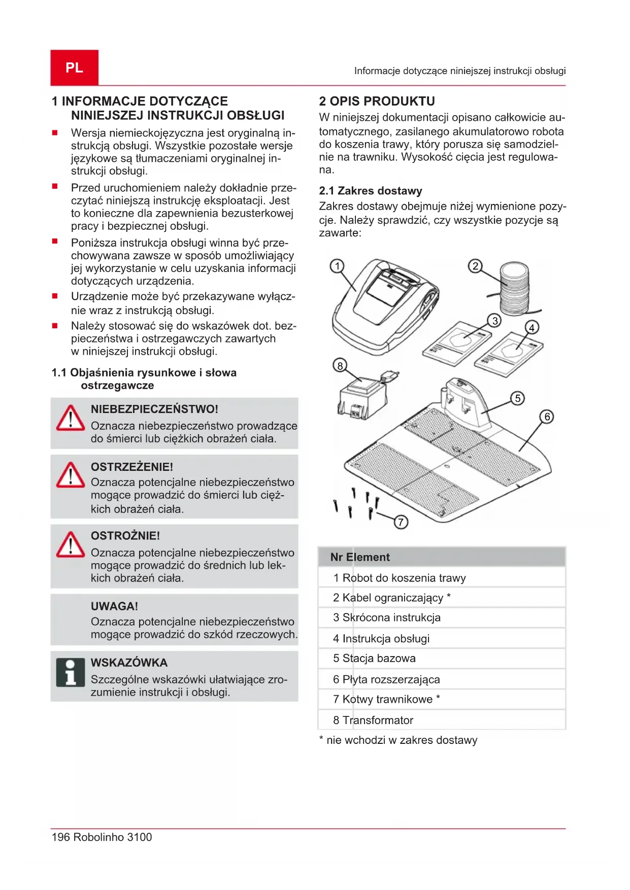 Nr Element 1 Robot do koszenia trawy 2 Kabel ograniczający * 3 Skrócona instrukcja 4 Instrukcja obsługi 5 Stacja bazowa 6 Płyta rozszerzająca 7 Kotwy trawnikowe * 8 Transformator