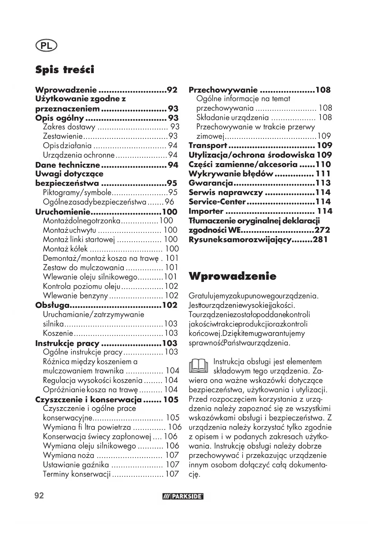 - Utylizacja/ochrona środowiska 109 Części zamienne/akcesoria p. 110