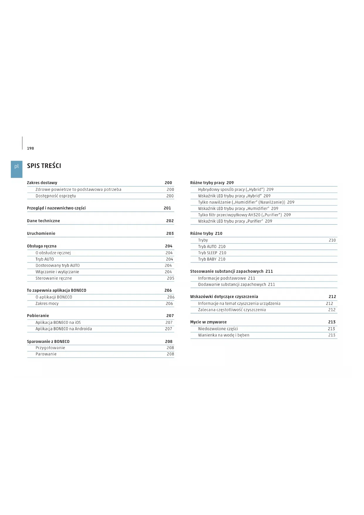 Różne tryby pracy 209 Hybrydowy sposób pracy („Hybrid”) 209 Wskaźnik LED trybu pracy „Hybrid” 209 Tylko nawilżanie („Humidifier” (Nawilżanie)) 209 Wskaźnik LED trybu pracy „Humidifier” 209 Tylko filtr przeciwpyłkowy AH320 („Purifier”) 209 Wskaźnik LED trybu pracy „Purifier” 209 Różne tryby 210 Tryby 210 Tryb AUTO 210 Tryb SLEEP 210 Tryb BABY 210 Stosowanie substancji zapachowych 211 Informacje podstawowe 211 Dodawanie substancji zapachowych 211 Wskazówki dotyczące czyszczenia 212 Informacje na temat czyszczenia urządzenia 212 Zalecana częstotliwość czyszczenia 212 Mycie w zmywarce 213 Niedozwolone części 213 Wanienka na wodę i bęben 213 Zakres dostawy 200 Zdrowe powietrze to podstawowa potrzeba 200 Dostępność osprzętu 200 Przegląd i nazewnictwo części 201 Dane techniczne 202 Uruchomienie 203 Obsługa ręczna 204 O obsłudze ręcznej 204 Tryb AUTO 204 Dostosowany tryb AUTO 204 Włączanie i wyłączanie 204 Sterowanie ręczne 205 To zapewnia aplikacja BONECO 206 O aplikacji BONECO 206 Zakres mocy 206 Pobieranie 207 Aplikacja BONECO na iOS 207 Aplikacja BONECO na Androida 207 Sparowanie z BONECO 208 Przygotowanie 208 Parowanie 208199