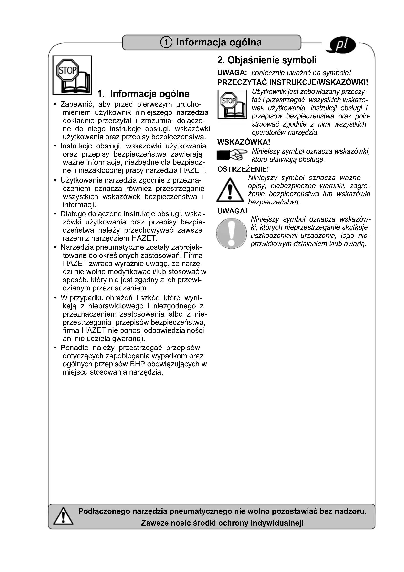 W przypadku obrażeń i szkód, które wyni- kają z nieprawidłowego i niezgodnego z przeznaczeniem zastosowania albo z nie- przestrzegania przepisów bezpieczeństwa, firma HAZET nie ponosi odpowiedzialności ani nie udziela gwarancji.