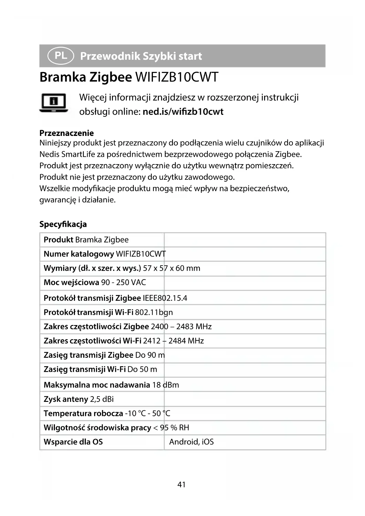 Przewodnik Szybki start Bramka Zigbee WIFIZB10CWT Więcej informacji znajdziesz w rozszerzonej instrukcji obsługi online: ned.is/wizb10cwt Przeznaczenie Niniejszy produkt jest przeznaczony do podłączenia wielu czujników do aplikacji Nedis SmartLife za pośrednictwem bezprzewodowego połączenia Zigbee. Produkt jest przeznaczony wyłącznie do użytku wewnątrz pomieszczeń. Produkt nie jest przeznaczony do użytku zawodowego. Wszelkie modykacje produktu mogą mieć wpływ na bezpieczeństwo, gwarancję i działanie. Specykacja Produkt Bramka Zigbee Numer katalogowy WIFIZB10CWT Wymiary (dł. x szer. x wys.) 57 x 57 x 60 mm Moc wejściowa 90 - 250 VAC Protokół transmisji Zigbee IEEE802.15.4 Protokół transmisji Wi-Fi 802.11bgn Zakres częstotliwości Zigbee 2400 – 2483 MHz Zakres częstotliwości Wi-Fi 2412 – 2484 MHz Zasięg transmisji Zigbee Do 90 m Zasięg transmisji Wi-Fi Do 50 m Maksymalna moc nadawania 18 dBm Zysk anteny 2,5 dBi Temperatura robocza -10 °C - 50 °C Wilgotność środowiska pracy < 95 % RH Wsparcie dla OS Android, iOS42 Główne części (rysunek A)