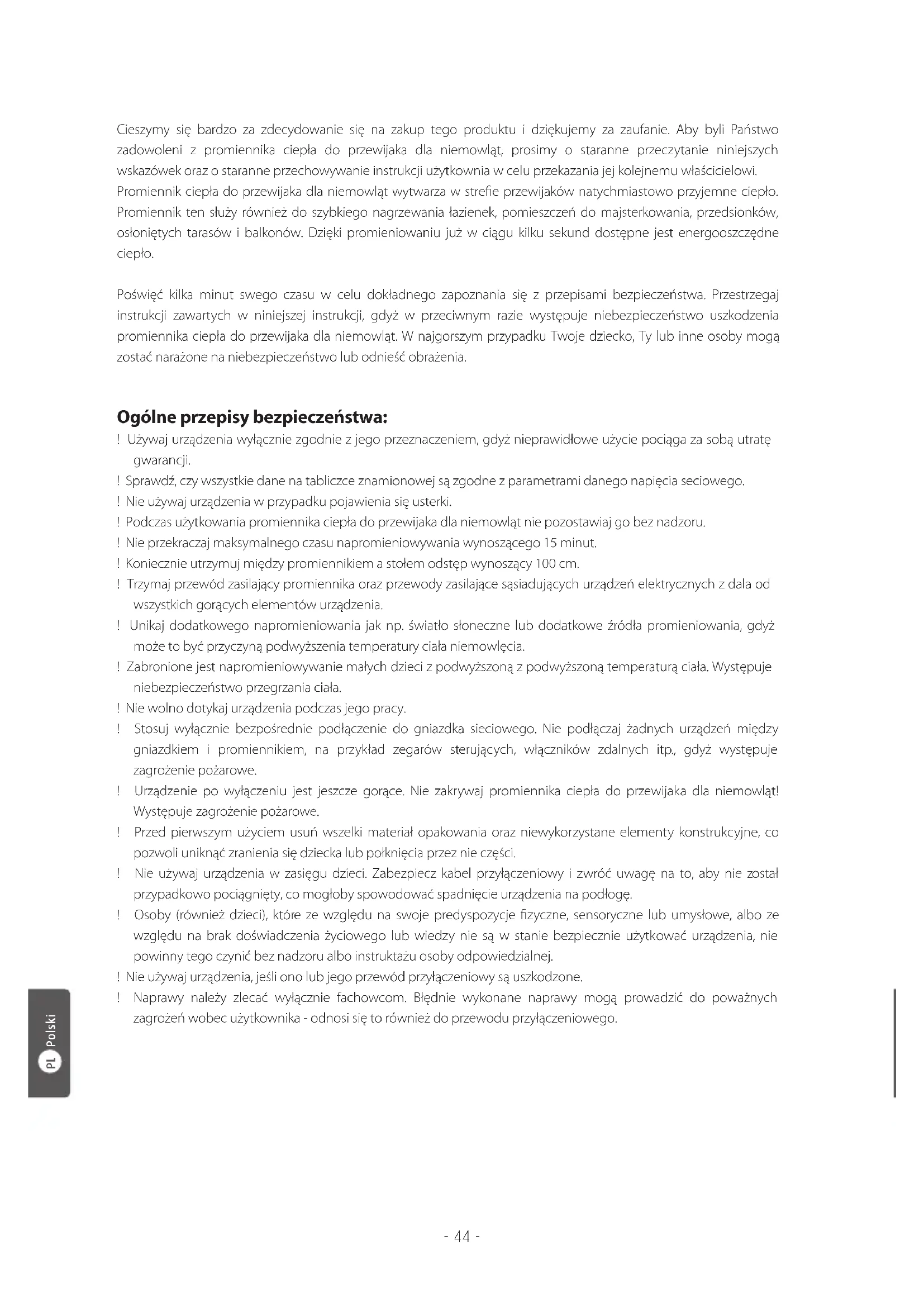 - Οι επιδιορθώσεις στη συσκευή επιτρέπεται να πραγματοποιούνται μόνο από ειδικό τεχνικό. Φυλάξτε την απόδειξη αγοράς, τις οδηγίες χρήσης και τον κωδικό είδους. Για οποιαδήποτε αξίωση στο πλαίσιο της εγγύησης ή αξιώσεις υπό δεσμεύσεις εγγύησης, απευθύνεστε αποκλειστικά στον έμπορο από τον οποίο αγοράσατε το προϊόν. Όλα τα τεχνικά δεδομένα, οι πληροφορίες και οι ιδιότητες του προϊοντος που περιγράφεται εδώ έχουν συνταχθεί με καλή πρόθεση και σύμφωνα με τη δημοσιοποιημένη έκδοση. Οι πληροφορίες που διαθέτει η reer πρέπει να είναι ορθές και αξιόπιστες. Η εταιρεία reer ωστόσο δεν αναλαμβάνει καμία ευθύνη για τυχόν σφάλματα μέσα σε αυτή την τεκμηρίωση και διατηρεί το δικαίωμα, όπως προβεί σε αλλαγές του σχεδιασμού του προϊόντος και των προδιαγραφών χωρίς προηγούμενη ειδοποίηση. Η ανατύπωση και η διάδοση των πληροφοριών αυτού του εντύπου που προστατεύεται από την αξίωση δικαιώματος πνευματικής ιδιοκτησίας σε οποιαδήποτε μορφή και με οποιοδήποτε τρόπο, με γραφικό τρόπο, με ηλεκτρονική ή μηχανικό, με τη βοήθεια φωτοτυπικών μηχανημάτων, ή αποθήκευση σε σύστημα αίτησης δεδομένων - ακόμα και αποσπασματικά - προϋποθέτει την προηγούμενη γραπτή έγκριση της εταιρείας reer. Υποδείξεις για την περιβαλλοντική προστασία: Αυτό το προϊόν, κατά το τέλος της διάρκειας της ζωής του απαγορεύεται να απορρίπτεται μαζί με τα οικιακά απορρίμματα, αλλά πρέπει να παραδοθεί σε αρμόδια υπηρεσία συλλογής για την ανακύκλωση ηλεκτρικών συσκευών. Το σύμβολο πάνω στο προϊόν, στις οδηγίες χρήσης ή τη συσκευασία αποτελεί σαφή υπόδειξη. Τα υλικά πρέπει να ανακυκλώνονται σύμφωνα με τη σήμανσή τους. Με την επανεχρησιμοποίηση, την ανακύκλωση των υλικών ή άλλες μορφές επαναξιοποίησης παλιών συσκευών, συμβάλλουμε και εμείς σημαντικά στην προστασία του περιβάλλοντός μας. Απευθυνθείτε στην διαχείριση της κοινότητάς σας για τις αρμόδιες υπηρεσίες απόρριψης.- 44 - Cieszymy się bardzo za zdecydowanie się na zakup tego produktu i dziękujemy za zaufanie. Aby byli Państwo zadowoleni z promiennika ciepła do przewijaka dla niemowląt, prosimy o staranne przeczytanie niniejszych wskazówek oraz o staranne przechowywanie instrukcji użytkownia w celu przekazania jej kolejnemu właścicielowi. Promiennik ciepła do przewijaka dla niemowląt wytwarza w stree przewijaków natychmiastowo przyjemne ciepło. Promiennik ten służy również do szybkiego nagrzewania łazienek, pomieszczeń do majsterkowania, przedsionków, osłoniętych tarasów i balkonów. Dzięki promieniowaniu już w ciągu kilku sekund dostępne jest energooszczędne ciepło. Poświęć kilka minut swego czasu w celu dokładnego zapoznania się z przepisami bezpieczeństwa. Przestrzegaj instrukcji zawartych w niniejszej instrukcji, gdyż w przeciwnym razie występuje niebezpieczeństwo uszkodzenia promiennika ciepła do przewijaka dla niemowląt. W najgorszym przypadku Twoje dziecko, Ty lub inne osoby mogą zostać narażone na niebezpieczeństwo lub odnieść obrażenia. Ogólne przepisy bezpieczeństwa: ! Używaj urządzenia wyłącznie zgodnie z jego przeznaczeniem, gdyż nieprawidłowe użycie pociąga za sobą utratę gwarancji. ! Sprawdź, czy wszystkie dane na tabliczce znamionowej są zgodne z parametrami danego napięcia seciowego. ! Nie używaj urządzenia w przypadku pojawienia się usterki. ! Podczas użytkowania promiennika ciepła do przewijaka dla niemowląt nie pozostawiaj go bez nadzoru. ! Nie przekraczaj maksymalnego czasu napromieniowywania wynoszącego 15 minut. ! Koniecznie utrzymuj między promiennikiem a stołem odstęp wynoszący 100 cm. ! Trzymaj przewód zasilający promiennika oraz przewody zasilające sąsiadujących urządzeń elektrycznych z dala od wszystkich gorących elementów urządzenia. ! Unikaj dodatkowego napromieniowania jak np. światło słoneczne lub dodatkowe źródła promieniowania, gdyż może to być przyczyną podwyższenia temperatury ciała niemowlęcia. ! Zabronione jest napromieniowywanie małych dzieci z podwyższoną z podwyższoną temperaturą ciała. Występuje niebezpieczeństwo przegrzania ciała. ! Nie wolno dotykaj urządzenia podczas jego pracy. ! Stosuj wyłącznie bezpośrednie podłączenie do gniazdka sieciowego. Nie podłączaj żadnych urządzeń między gniazdkiem i promiennikiem, na przykład zegarów sterujących, włączników zdalnych itp., gdyż występuje zagrożenie pożarowe. ! Urządzenie po wyłączeniu jest jeszcze gorące. Nie zakrywaj promiennika ciepła do przewijaka dla niemowląt! Występ