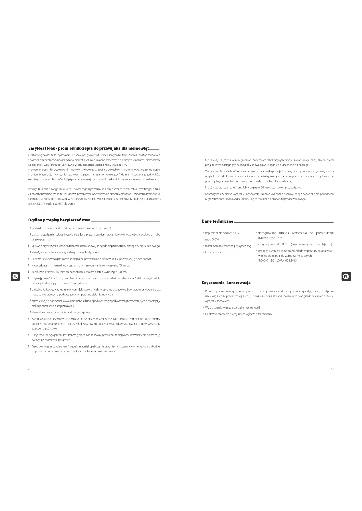 - promieniowanie cieplne oraz rozkład temperatury sprawdzone według standardu dla wyrobów medycznych (IEC60601-2-21:2009,AMD1:2016) ! Nie używaj urządzenia w zasięgu dzieci. Zabezpiecz kabel przyłączeniowy i zwróć uwagę na to, aby nie został przypadkowo pociągnięty, co mogłoby spowodować spadnięcie urządzenia na podłogę. ! Osoby (również dzieci), które ze względu na swoje predyspozycje fizyczne, sensoryczne lub umysłowe, albo ze względu na brak doświadczenia życiowego lub wiedzy nie są w stanie bezpiecznie użytkować urządzenia, nie powinny tego czynić bez nadzoru albo instruktażu osoby odpowiedzialnej. ! Nie używaj urządzenia, jeśli ono lub jego przewód przyłączeniowy są uszkodzone.