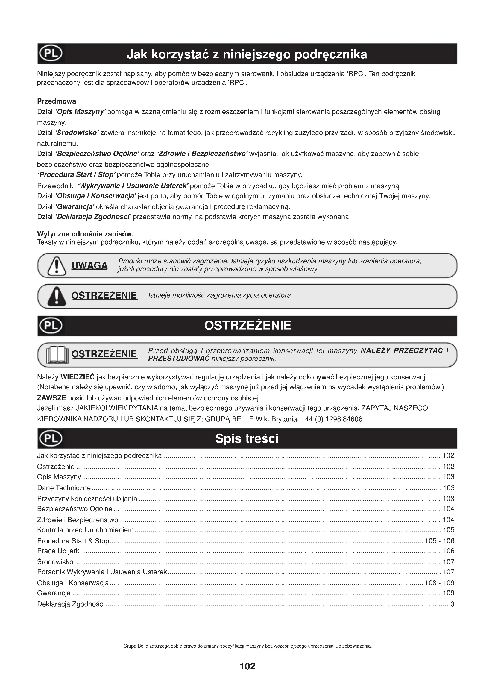 - Moottorin sytytystulppa Altrad Belle ja/tai valtuutettu myyntiedustaja, johtajat, työntekijät ja vakuutusyhtiöt eivät vastaa seurauksista eivätkä muista vahingoista, vaurioista tai kustannuksista, jotka aiheutuvat siitä, että laitetta ei voida käyttää. Takuuvaateet Kaikki takuuvaateet tulee lähettää Altrad Bellein edustajalle puhelimella, faksilla, sähköpostilla tai kirjeitse. Puhelin: +44 (0)1298 84606, Faksi: +44 (0)1298 84073 Sähköposti: warranty@belle-group.co.uk Takuuvaateet tulee esittää seuraavaan osoitteeseen: Altrad Belle Warranty Department, Sheen, Nr. Buxton Derbyshire SK17 0EU England Tuotteen takuurekisteröinti: ALTRAD Belle haluaa kaikessa toiminnassaan tukea luonnonmukaisia, vihreitä arvoja. Tästä syystä olemme ottaneet käyttöön paperittoman, verkossa tehtävän takuurekisteröinnin. Rekisteröinti tapahtuu osoitteessa http://www.bellegroup.com/index.php?p=warranty_registration Vaihtoehtoisesti voit lukea oheisen QR-koodin älypuhelimellasi ja mennä rekisteröintisivulle sen kautta.102 Jak korzystaü z niniejszego podrĊcznika Spis treĞci OSTRZEĩENIE Produkt moĪe stanowiü zagroĪenie. Istnieje ryzyko uszkodzenia maszyny lub zranienia operatora, jeĪeli procedury nie zostaáy przeprowadzone w sposób wáaĞciwy. UWAGA OSTRZEĩENIE Istnieje moĪliwoĞü zagroĪenia Īycia operatora. NaleĪy WIEDZIEû jak bezpiecznie wykorzystywaü regulacjĊ urządzenia i jak naleĪy dokonywaü bezpiecznej jego konserwacji. (Notabene naleĪy siĊ upewniü, czy wiadomo, jak wyáączyü maszynĊ juĪ przed jej wáączeniem na wypadek wystąpienia problemów.) ZAWSZE nosiü lub uĪywaü odpowiednich elementów ochrony osobistej. JeĪeli masz JAKIEKOLWIEK PYTANIA na temat bezpiecznego uĪywania i konserwacji tego urządzenia, ZAPYTAJ NASZEGO KIEROWNIKA NADZORU LUB SKONTAKTUJ SIĉ Z: GRUPĄ BELLE Wlk. Brytania. +44 (0) 1298 84606 OSTRZEĩENIE Przed obsáugą i przeprowadzaniem konserwacji tej maszyny NALEĩY PRZECZYTAû i PRZESTUDIOWAû niniejszy podrĊcznik. Grupa Belle zastrzega sobie prawo do zmiany specy¿ kacji maszyny bez wczeĞniejszego uprzedzenia lub zobowiązania. Niniejszy podrĊcznik zostaá napisany, aby pomóc w bezpiecznym sterowaniu i obsáudze urządzenia ‘RPC’. Ten podrĊcznik przeznaczony jest dla sprzedawców i operatorów urządzenia ‘RPC’. Przedmowa Dziaá ‘Opis Maszyny’ pomaga w zaznajomieniu siĊ z rozmieszczeniem i funkcjami sterowania poszczególnych elementów obsáugi maszyny. Dziaá ‘ĝrodowisko’ zawiera instrukcje na temat tego, jak przeprowadzaü recykling zuĪytego przyrządu w sposób przyjazny Ğrodowisku naturalnemu. Dziaá ‘BezpieczeĔstwo Ogólne’ oraz ‘Zdrowie i BezpieczeĔstwo’ wyjaĞnia, jak uĪytkowaü maszynĊ, aby zapewniü sobie bezpieczeĔstwo oraz bezpieczeĔstwo ogólnospoáeczne. ‘Procedura Start i Stop’ pomoĪe Tobie przy uruchamianiu i zatrzymywaniu maszyny. Przewodnik ‘Wykrywanie i Usuwanie Usterek’ pomoĪe Tobie w przypadku, gdy bĊdziesz mieü problem z maszyną. Dziaá ‘Obsáuga i Konserwacja’ jest po to, aby pomóc Tobie w ogólnym utrzymaniu oraz obsáudze technicznej Twojej maszyny. Dziaá ’Gwarancja’ okreĞla charakter objĊcia gwarancj ą i procedurĊ reklamacyjną. Dziaá ‘Deklaracja ZgodnoĞci’ przedstawia normy, na podstawie których maszyna zostaáa wykonana. Wytyczne odnoĞnie zapisów. Teksty w niniejszym podrĊczniku, którym naleĪy oddaü szczególną uwagĊ, są przedstawione w sposób nastĊpujący. Jak korzystaü z niniejszego podrĊcznika .............................................................................................................................................. 102 OstrzeĪenie ........................................................................................................................................................................................... 102 Opis Maszyny ........................................................................................................................................................................................ 103 Dane Techniczne ................................................................................................................................................................................... 103 Przyczyny koniecznoĞci ubijania ........................................................................................................................................................... 103 BezpieczeĔstwo Ogólne ........................................................................................................................................................................ 104 Zdrowie i BezpieczeĔstwo ..................................................................................................................................................................... 104 Kontrola przed Uruchomieniem ............................................................................................................................................................. 105 Procedura Start & Stop................................................................................................................................................................. 105 - 106 Praca Ubijarki ........................................................................................................................................................................................ 106 ĝrodowisko ............................................................................................................................................................................................ 107 Poradnik Wykrywania i Usuwania Usterek ............................................................................................................................................ 107 Obsáuga i Konserwacja ....................................................................................................................