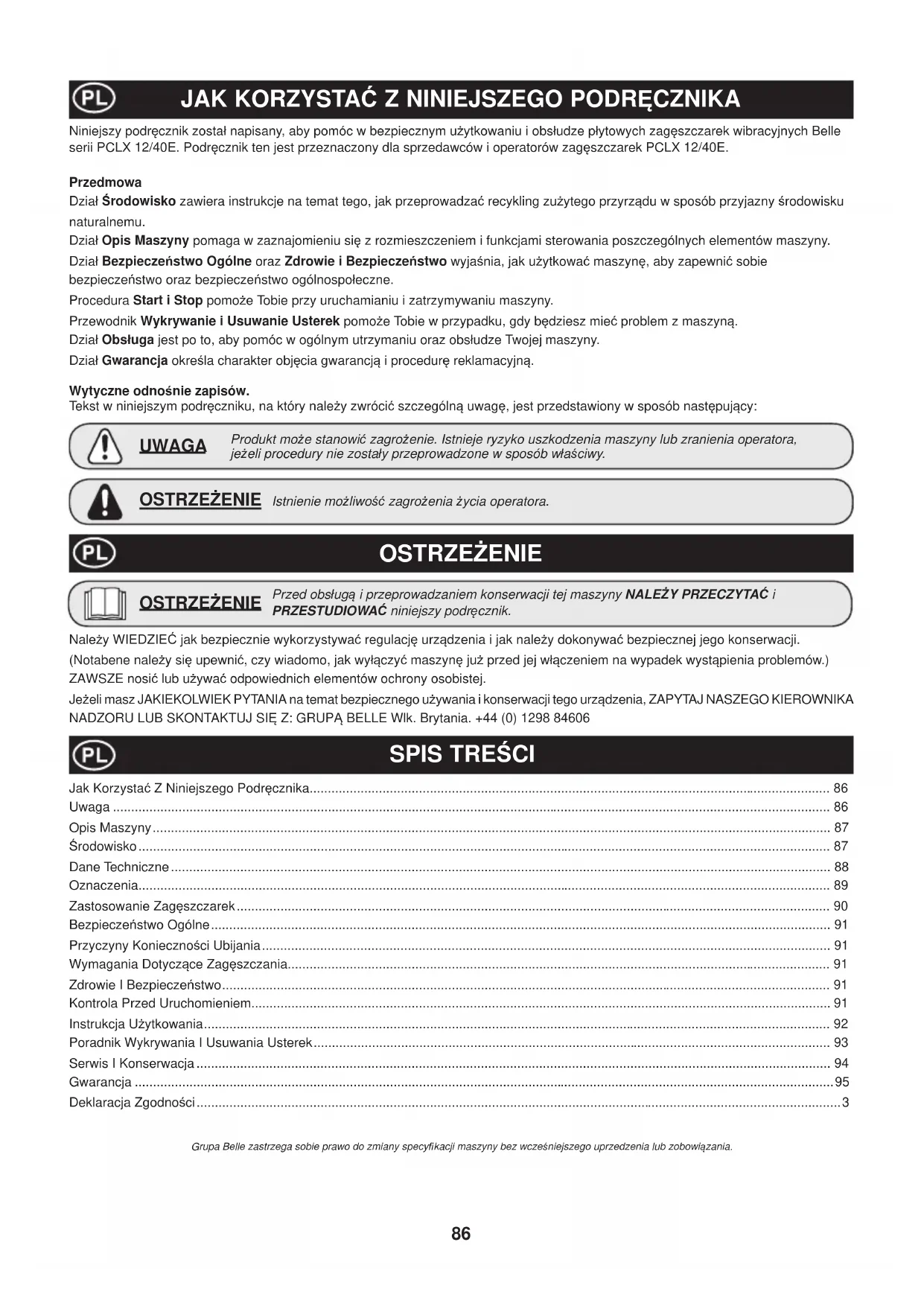 - Vetohihna/-t Altrad Belle ja/tai sen valtuuttamat maahantuojat, johtajat, työntekijät tai vakuuttajat eivät ole vastuussa välillisistä tai muista vahingoista, tappioista tai mistään kuluista, jotka aiheutuvat laitteen käyttökelvottomuudesta tai muusta laitteen käytöstä johtuvasta syystä. Takuu hakemus Kaikki takuuhakemukset osoitetaan Several Oy:lle, puhelimella, Faksilla, sähköpostilla tai kirjallisesti. Takuuhakemukset: Tel: +44 (0)1298 84606 Fax: +44 (0)1298 84722 Email : warranty@belle-group.co.uk Kirjallisesti: Altrad Belle Warranty Department, Sheen, Nr. Buxton Derbyshire SK17 0EU, England86 JAK KORZYSTAû Z NINIEJSZEGO PODRĉCZNIKA SPIS TREĝCI OSTRZEĩENIE Produkt moĪe stanowiü zagroĪenie. Istnieje ryzyko uszkodzenia maszyny lub zranienia operatora, jeĪeli procedury nie zostaáy przeprowadzone w sposób wáaĞciwy. UWAGA NaleĪy WIEDZIEû jak bezpiecznie wykorzystywaü regulacjĊ urządzenia i jak naleĪy dokonywaü bezpiecznej jego konserwacji. (Notabene naleĪy siĊ upewniü, czy wiadomo, jak wyáączyü maszynĊ juĪ przed jej wáączeniem na wypadek wystąpienia problemów.) ZAWSZE nosiü lub uĪywaü odpowiednich elementów ochrony osobistej. JeĪeli masz JAKIEKOLWIEK PYTANIA na temat bezpiecznego uĪywania i konserwacji tego urządzenia, ZAPYTAJ NASZEGO KIEROWNIKA NADZORU LUB SKONTAKTUJ SIĉ Z: GRUPĄ BELLE Wlk. Brytania. +44 (0) 1298 84606 Grupa Belle zastrzega sobie prawo do zmiany specy¿ kacji maszyny bez wczeĞniejszego uprzedzenia lub zobowiązania. Niniejszy podrĊcznik zostaá napisany, aby pomóc w bezpiecznym uĪytkowaniu i obsáudze páytowych zagĊszczarek wibracyjnych Belle serii PCLX 12/40E. PodrĊcznik ten jest przeznaczony dla sprzedawców i operatorów zagĊszczarek PCLX 12/40E. Przedmowa Dziaá ĝrodowisko zawiera instrukcje na temat tego, jak przeprowadzaü recykling zuĪytego przyrządu w sposób przyjazny Ğrodowisku naturalnemu. Dziaá Opis Maszyny pomaga w zaznajomieniu siĊ z rozmieszczeniem i funkcjami sterowania poszczególnych elementów maszyny. Dziaá BezpieczeĔstwo Ogólne oraz Zdrowie i BezpieczeĔstwo wyjaĞnia, jak uĪytkowaü maszynĊ, aby zapewniü sobie bezpieczeĔstwo oraz bezpieczeĔstwo ogólnospoáeczne. Procedura Start i Stop pomoĪe Tobie przy uruchamianiu i zatrzymywaniu maszyny. Przewodnik Wykrywanie i Usuwanie Usterek pomoĪe Tobie w przypadku, gdy bĊdziesz mieü problem z maszyną. Dziaá Obsáuga jest po to, aby pomóc w ogólnym utrzymaniu oraz obsáudze Twojej maszyny. Dziaá Gwarancja okreĞla charakter objĊ cia gwarancją i procedurĊ reklamacyjną. Wytyczne odnoĞnie zapisów. Tekst w niniejszym podrĊczniku, na który naleĪy zwróciü szczególną uwagĊ, jest przedstawiony w sposób nastĊpujący: Jak Korzystaü Z Niniejszego PodrĊcznika............................................................................................................................................... 86 Uwaga ..................................................................................................................................................................................................... 86 Opis Maszyny .......................................................................................................................................................................................... 87 ĝrodowisko .............................................................................................................................................................................................. 87 Dane Techniczne ..................................................................................................................................................................................... 88 Oznaczenia.............................................................................................................................................................................................. 89 Zastosowanie ZagĊszczarek ................................................................................................................................................................... 90 BezpieczeĔstwo Ogólne .......................................................................................................................................................................... 91 Przyczyny KoniecznoĞci Ubijania ............................................................................................................................................................ 91 Wymagania Dotyczące ZagĊszczania ..................................................................................................................................................... 91 Zdrowie I BezpieczeĔstwo ....................................................................................................................................................................... 91 Kontrola Przed Uruchomieniem............................................................................................................................................................... 91 Instrukcja UĪytkowania ............................................................................................................................................................................ 92 Poradnik Wykrywania I Usuwania Usterek .............................................................................................................................................. 93 Serwis I Konserwacja .............................................................................................................................................................................. 94 Gwarancja ................................................................................................................................................................................................95 Deklaracja ZgodnoĞci .................................................................................