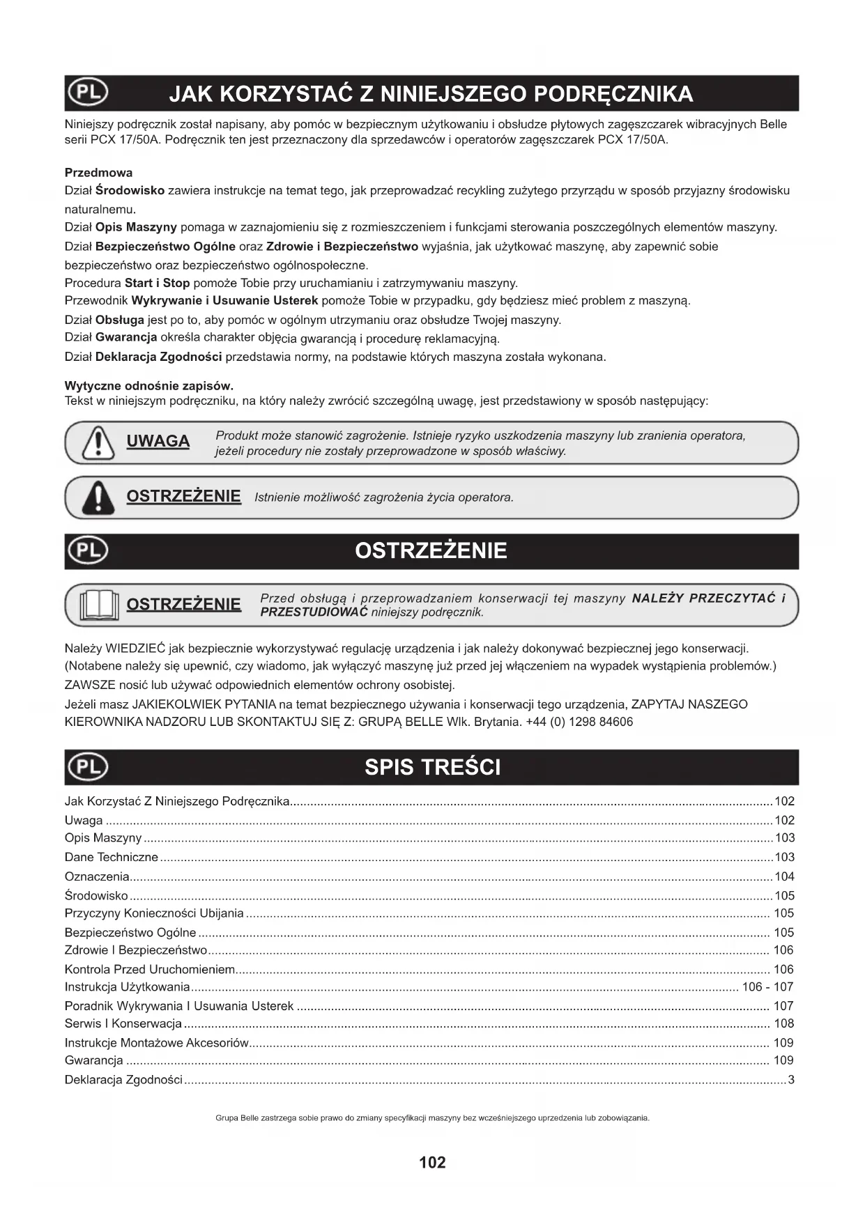 E - Oznaczenie Koáo Zestaw MontaĪ (800/99420) Zapoznaj siĊ z sekcją “Instrukcje MontaĪowe Akcesoriów” z tej strony do wyjaĞnienia.105 ĝrodowisko Przyczyny KoniecznoĞci Ubijania Bezpieczne usuwanie odpadów. Instrukcje ochrony Ğrodowiska naturalnego. Maszyna zawiera materiaáy wartoĞciowe. ZuĪytą aparaturĊ i akcesoria umieszczaj w odpowiednich urządzeniach do recyklingu. Grunt, który zostaá naruszony lub na nowo wypeániony, naniesiona zostaáa nowa dolna warstwa noĞna lub nawierzchnia bitumiczna, bĊdzie posiadaá puste przestrzenie lub dziury powietrzne, które, jeĪeli nie zostaną ubite, bĊdą prowadziü do pojawiania siĊ jednego lub wielu problemów. 1. PoniewaĪ ruch przechodzi przez powierzchniĊ o obszarach nieubitych, materiaá jest ĞciĞniĊty. Prowadzi to do zapadania siĊ górnej powierzchni, gdyĪ materiaá wypeánia luki. 2. Podobna sytuacja ma miejsce przy obciąĪeniach statycznych na nieubitym podáoĪu. ObciąĪenie (np. budynek) bĊdzie siĊ zapadaü. 3. Materiaáy z pustymi lukami są bardziej wraĪliwe na przesączanie wodą, co prowadzi do erozji. Pocháanianie wody moĪe takĪe powodowaü rozszerzanie siĊ gruntu podczas niskich temperatur i jego kurczenie podczas krótkich okresów suszy. RozszerzalnoĞü i kurczliwoĞü są gáównymi przyczynami niszczenia fundamentów budynków i prowadzą zwykle do tego, Īe konstrukcje ich muszą zostaü podparte. Ubijanie zwiĊksza gĊstoĞü materiaáu i tym samym zwiĊksza jej zdolnoĞü przenoszenia obciąĪeĔ. Zmniejsza puste przestrzenie i tym samym zmniejsza ryzyko zapadania siĊ, rozszerzania i kurczenia siĊ na skutek przenikania wody. BezpieczeĔstwo Ogólne Dla bezpieczeĔstwa wáasnego oraz bezpieczeĔstwa wszystkich przebywających wokóá naleĪy przeczytaü i upewniü siĊ, czy siĊ rozumie, nastĊpujące informacje nt. bezpieczeĔstwa. Operator jest odpowiedzialny za to, aby upewniá siĊ, Īe w peáni rozumie, jak bezpiecznie obsáugiwaü urządzenie. W przypadkach niepewnoĞci co do bezpiecznego i wáaĞciwego uĪytkowania zagĊszczarki wibracyjnej skonsultuj siĊ ze swym kierownikiem nadzoru lub przedstawicielem Altrad Belle.