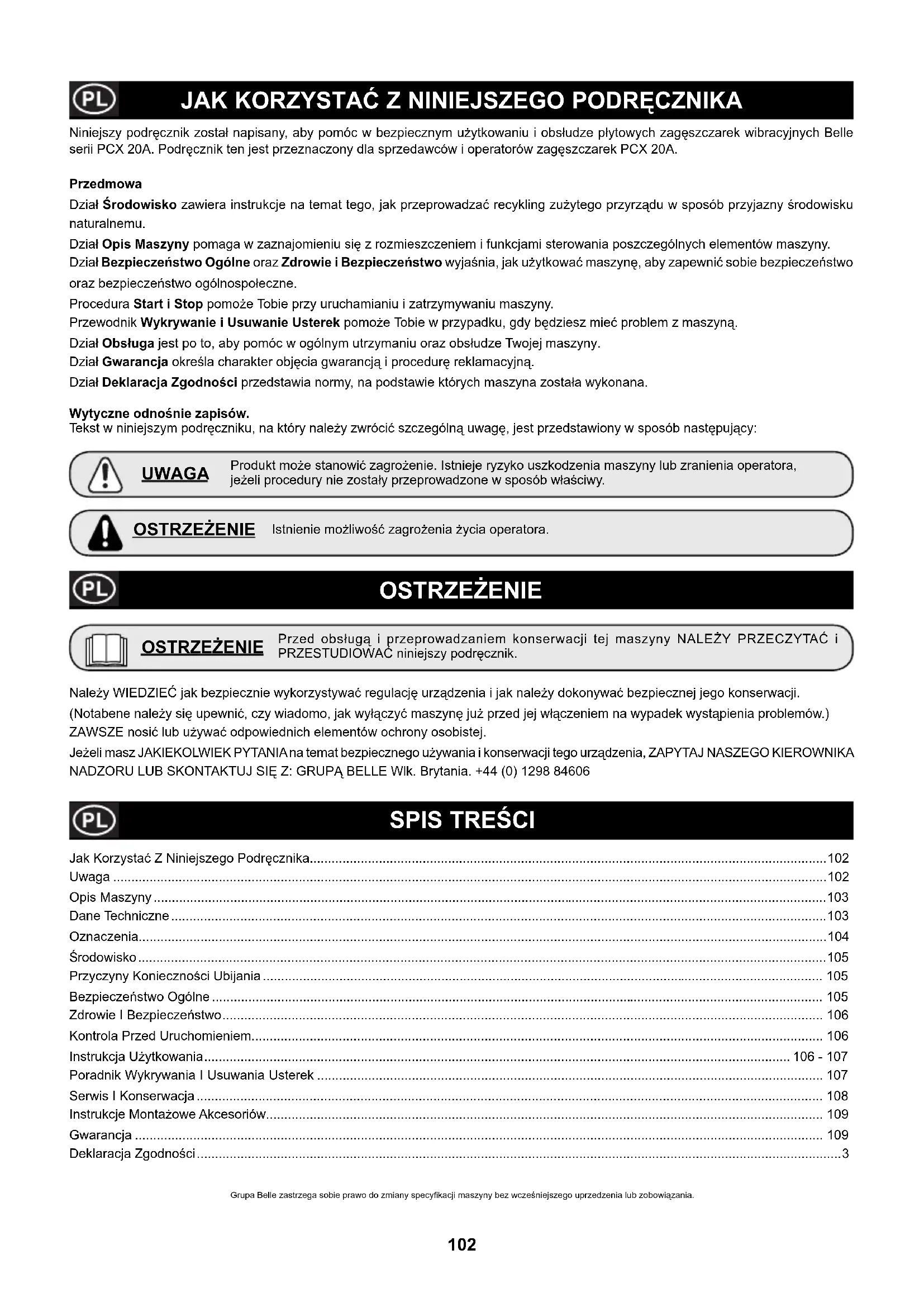 - OSTRZE¢ENIE Produkt moe stanowi zagroenie. Istnieje ryzyko uszkodzenia maszyny lub zranienia operatora, jeeli procedury nie zostay przeprowadzone w sposób waciwy. UWAGA Naley WIEDZIE jak bezpiecznie wykorzystywa regulacj urzdzenia i jak naley dokonywa bezpiecznej jego konserwacji. (Notabene naley si upewni, czy wiadomo, jak wyczy maszyn ju przed jej wczeniem na wypadek wystpienia problemów.) ZAWSZE nosi lub uywa odpowiednich elementów ochrony osobistej. Jeeli masz JAKIEKOLWIEK PYTANIA na temat bezpiecznego uywania i konserwacji tego urzdzenia, ZAPYTAJ NASZEGO KIEROWNIKA NADZORU LUB SKONTAKTUJ SI Z: GRUP BELLE Wlk. Brytania. +44 (0) 1298 84606 Grupa Belle zastrzega sobie prawo do zmiany specyë kacji maszyny bez wczeniejszego uprzedzenia lub zobowizania. Niniejszy podrcznik zosta napisany, aby pomóc w bezpiecznym uytkowaniu i obsudze pytowych zagszczarek wibracyjnych Belle serii PCX 20A. Podrcznik ten jest przeznaczony dla sprzedawców i operatorów zagszczarek PCX 20A. Przedmowa Dzia ¡rodowisko zawiera instrukcje na temat tego, jak przeprowadza recykling zuytego przyrzdu w sposób przyjazny rodowisku naturalnemu. Dzia Opis Maszyny pomaga w zaznajomieniu si z rozmieszczeniem i funkcjami sterowania poszczególnych elementów maszyny. Dzia Bezpiecze£stwo Ogólne oraz Zdrowie i Bezpiecze£stwo wyjania, jak uytkowa maszyn, aby zapewni sobie bezpieczestwo oraz bezpieczestwo ogólnospoeczne. Procedura Start i Stop pomoe Tobie przy uruchamianiu i zatrzymywaniu maszyny. Przewodnik Wykrywanie i Usuwanie Usterek pomoe Tobie w przypadku, gdy bdziesz mie problem z maszyn. Dzia Obs¤uga jest po to, aby pomóc w ogólnym utrzymaniu oraz obsudze Twojej maszyny. Dzia Gwarancja okrela charakter objcia gwarancj i procedur reklamacyjn. Dzia Deklaracja Zgodno¥ci przedstawia normy, na podstawie których maszyna zostaa wykonana. Wytyczne odno¥nie zapisów. Tekst w niniejszym podrczniku, na który naley zwróci szczególn uwag, jest przedstawiony w sposób nastpujcy: Jak Korzysta Z Niniejszego Podrcznika p. 102
