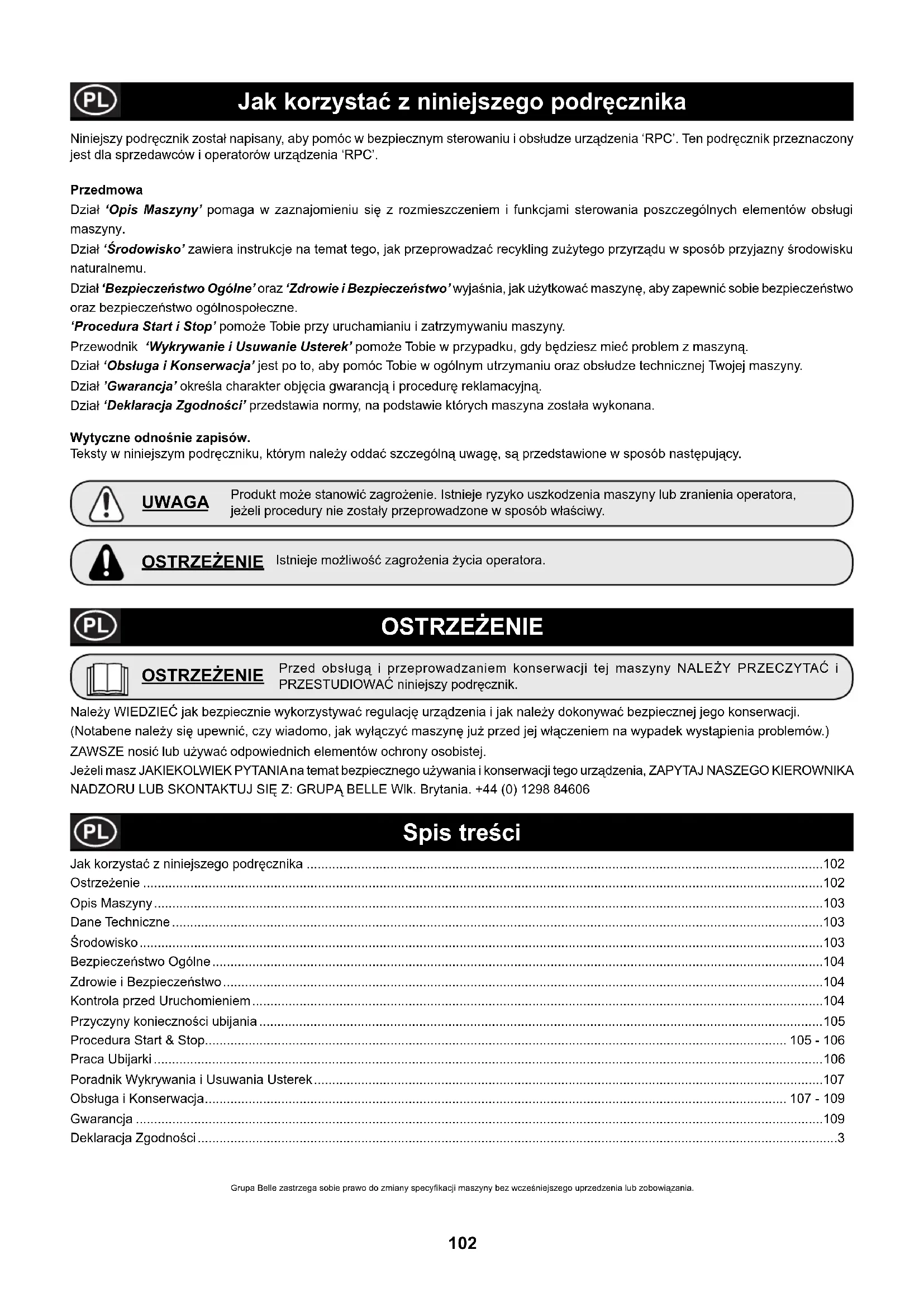 - Moottorin sytytystulppa Belle Group ja/tai sen valtuuttama maahantuoja, johtajat, työntekijät tai vakuuttajat eivät ole vastuussa välillisistä tai muista vahingoista, tappioista tai mistään kuluista, jotkaaiheutuvat laitteen käyttökelvottomuudesta tai muusta laitteen käytöstä johtuvasta syystä. Takuuhakemus Kaikki takuuhakemukset tulee aluksi osoittaa Belle Group , puhelimitse, Faksilla, sähköpostilla tai kirjallisesti. Takuuhakemukset: Belle Group Warranty Department, Sheen, Nr. Buxton Derbyshire SK17 0EU England Tel: +44 (0)1298 84606 Fax: +44 (0)1298 84722 Email : warranty@belle-group.co.uk102 Jak korzysta z niniejszego podrcznika Spis treci OSTRZEENIE Produkt moe stanowi zagroenie. Istnieje ryzyko uszkodzenia maszyny lub zranienia operatora, jeeli procedury nie zostay przeprowadzone w sposób waciwy. UWAGA OSTRZEENIE Naley WIEDZIE jak bezpiecznie wykorzystywa regulacj urzdzenia i jak naley dokonywa bezpiecznej jego konserwacji. (Notabene naley si upewni, czy wiadomo, jak wyczy maszyn ju przed jej wczeniem na wypadek wystpienia problemów.) ZAWSZE nosi lub uywa odpowiednich elementów ochrony osobistej. Jeeli masz JAKIEKOLWIEK PYTANIA na temat bezpiecznego uywania i konserwacji tego urzdzenia, ZAPYTAJ NASZEGO KIEROWNIKA NADZORU LUB SKONTAKTUJ SI Z: GRUP BELLE Wlk. Brytania. +44 (0) 1298 84606 Przed obsug i przeprowadzaniem konserwacji tej maszyny NALEY PRZECZYTA i PRZESTUDIOWA niniejszy podrcznik. Grupa Belle zastrzega sobie prawo do zmiany specyÈ kacji maszyny bez wczeniejszego uprzedzenia lub zobowizania. Niniejszy podrcznik zosta napisany, aby pomóc w bezpiecznym sterowaniu i obsudze urzdzenia ‘RPC’. Ten podrcznik przeznaczony jest dla sprzedawców i operatorów urzdzenia ‘RPC’. Przedmowa Dzia ‘Opis Maszyny’ pomaga w zaznajomieniu si z rozmieszczeniem i funkcjami sterowania poszczególnych elementów obsugi maszyny. Dzia ‘rodowisko’ zawiera instrukcje na temat tego, jak przeprowadza recykling zuytego przyrzdu w sposób przyjazny rodowisku naturalnemu. Dzia ‘Bezpieczestwo Ogólne’ oraz ‘Zdrowie i Bezpieczestwo’ wyjania, jak uytkowa maszyn, aby zapewni sobie bezpieczestwo oraz bezpieczestwo ogólnospoeczne. ‘Procedura Start i Stop’ pomoe Tobie przy uruchamianiu i zatrzymywaniu maszyny. Przewodnik ‘Wykrywanie i Usuwanie Usterek’ pomoe Tobie w przypadku, gdy bdziesz mie problem z maszyn. Dzia ‘Obsuga i Konserwacja’ jest po to, aby pomóc Tobie w ogólnym utrzymaniu oraz obsudze technicznej Twojej maszyny. Dzia ’Gwarancja’ okrela charakter objcia gwarancj i procedur reklamacyjn. Dzia ‘Deklaracja Zgodnoci’ przedstawia normy, na podstawie których maszyna zostaa wykonana. Wytyczne odnonie zapisów. Teksty w niniejszym podrczniku, którym naley odda szczególn uwag, s przedstawione w sposób nastpujcy. OSTRZEENIE Istnieje moliwo zagroenia ycia operatora. Jak korzysta z niniejszego podrcznika ..............................................................................................................................................102 Ostrzeenie ...........................................................................................................................................................................................102 Opis Maszyny ........................................................................................................................................................................................103 Dane Techniczne ...................................................................................................................................................................................103 rodowisko ............................................................................................................................................................................................103 Bezpieczestwo Ogólne ........................................................................................................................................................................104 Zdrowie i Bezpieczestwo .....................................................................................................................................................................104 Kontrola przed Uruchomieniem .............................................................................................................................................................104 Przyczyny koniecznoci ubijania ...........................................................................................................................................................105 Procedura Start & Stop................................................................................................................................................................ 105 - 106 Praca Ubijarki ........................................................................................................................................................................................106 Poradnik Wykrywania i Usuwania Usterek ............................................................................................................................................107 Obsuga i Konserwacja ................................................................................................................................................................ 107 - 109 Gwarancja .............................................................................................................................................................................................109 Deklaracja Zgodnoci ................................................................................................................................................................................3103 Opis Maszyny