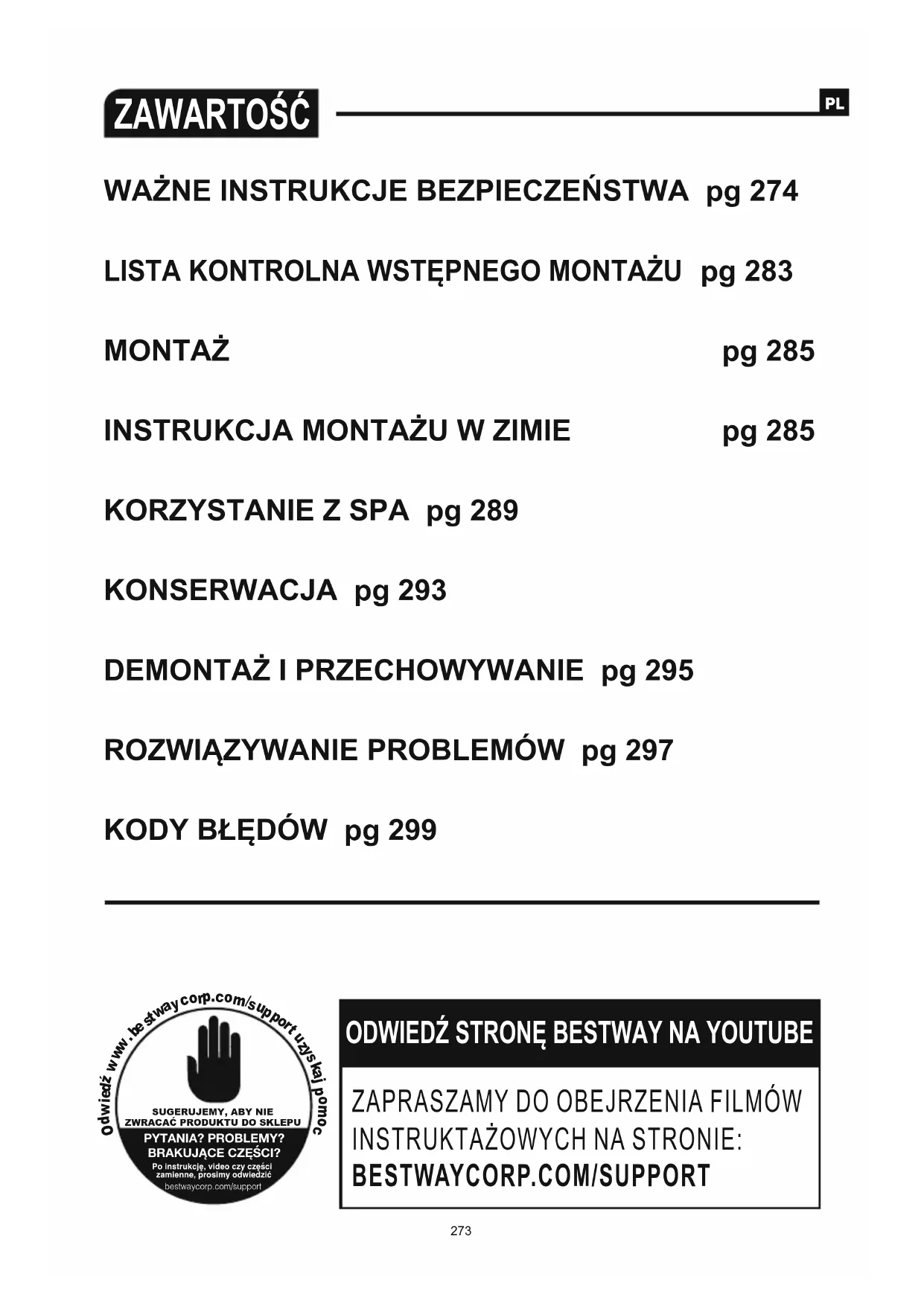 pg 285 KORZYSTANIE Z SPA pg 289 KONSERWACJA pg 293 DEMONTAŻ I PRZECHOWYWANIE pg 295 ROZWIĄZYWANIE PROBLEMÓW pg 297 KODY BŁĘDÓW pg 299INSTRUKCJE BEZPIECZEŃSTWA Uważnie przeczytaj ze zrozumieniem i stosuj się do wszystkich informacji tej instrukcji użytkownika, przed instalacją i korzystaniem ze spa. WAŻNE INSTRUKCJE DOTYCZĄCE BEZPIECZEŃSTWA - PRZECZYTAJ I STOSUJ SIĘ DO WSZYSTKICH INSTRUKCJI. OSTRZEŻENIE: