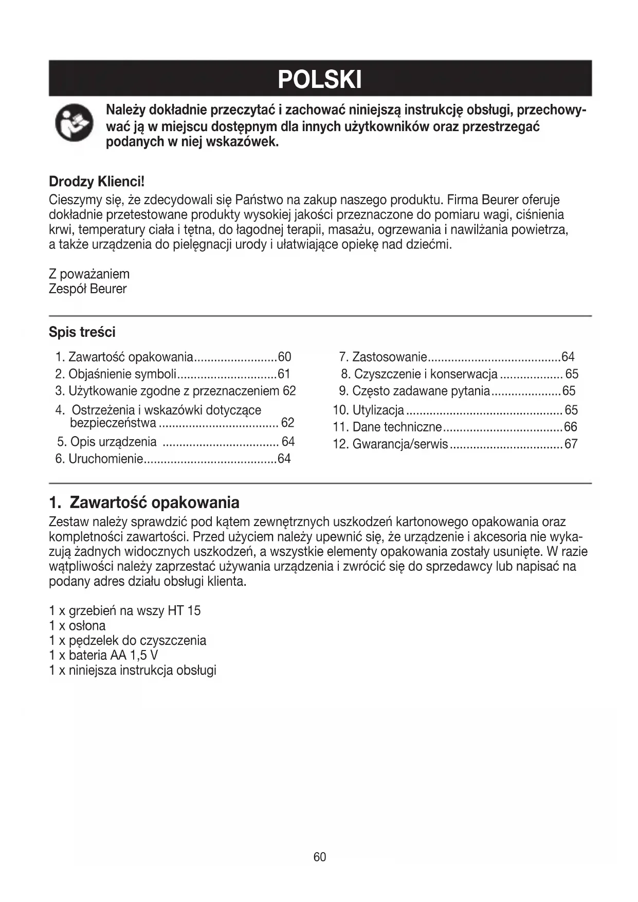 zują żadnych widocznych uszkodzeń, awszystkie elementy opakowania zostały usunięte. Wrazie wątpliwości należy zaprzestać używania urządzenia izwrócić się do sprzedawcy lub napisać na podany adres działu obsługi klienta. 1 xgrzebień na wszy HT 15 1 xosłona 1 xpędzelek do czyszczenia 1 xbateria AA 1,5 V 1 xniniejsza instrukcja obsługi Spis treści61