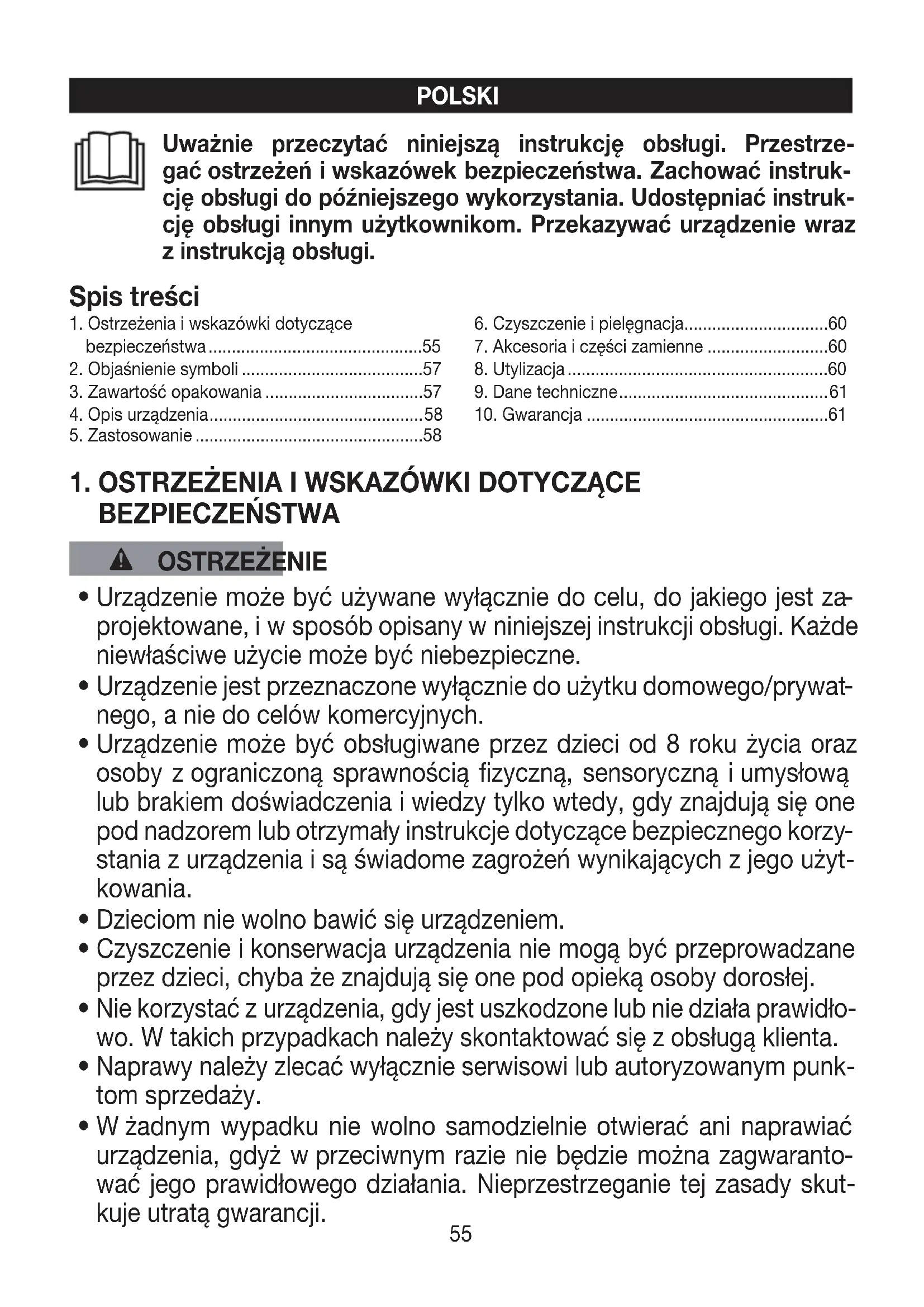 Возможны ошибки и изменения55 Uważnie przeczytać niniejszą instrukcję obsługi. Przestrze- gaćostrzeżeń iwskazówek bezpieczeństwa. Zachować instruk- cję obsługi do późniejszego wykorzystania. Udostępniać instruk- cję obsługi innym użytkownikom. Przekazywać urządzenie wraz zinstrukcją obsługi. Spis treści POLSKI