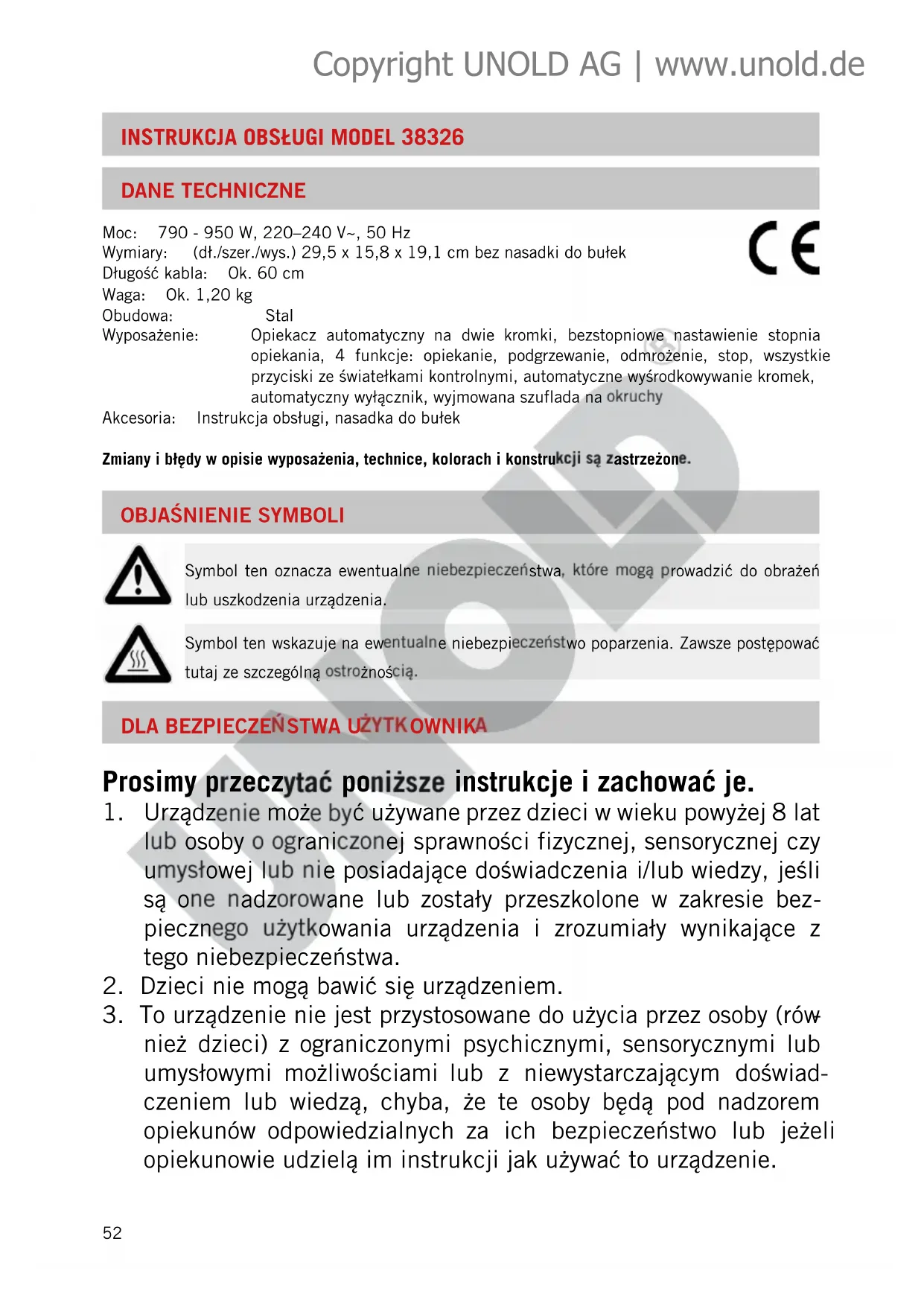 nie wykwalifikowaną osobę zostać zastąpiony w celu uniknięcia zagrożenia. OSTROŻNIE: Urządzenie podczas pracy jest bardzo gorące! W żadnym wypadku nie otwierać obudowy urządzenia. Nie wkładać narzędzi, sztućców ani części ciała do szpara dla chleb. Istnieje niebezpieczeństwo porażenia prądem. Producent nie przejmuje odpowiedzialności za nieodpowiednie bądź wadliwe użytkowanie lub po przeprowadzonych naprawach przez nieautoryzowane zakłady bądź niekompetentne osoby. Copyright UNOLD AG | www.unold.de55