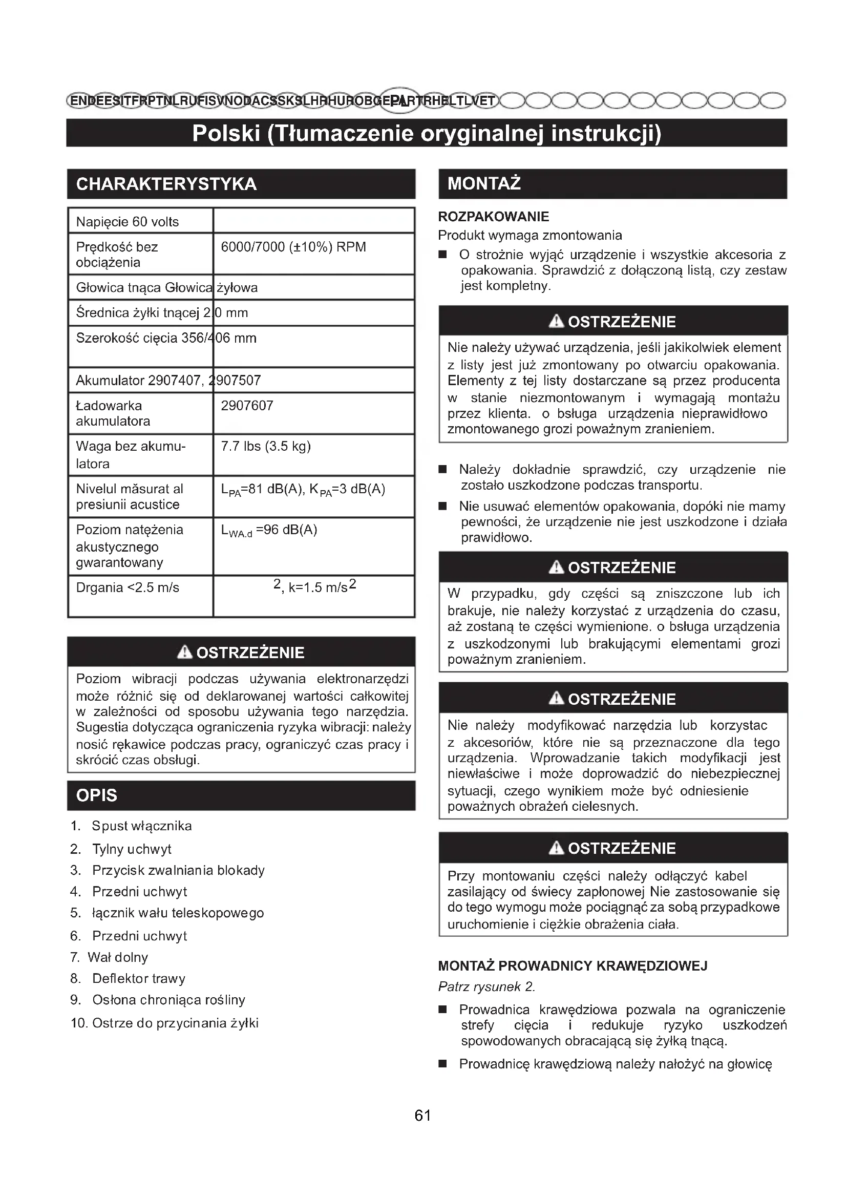 EN DE ES IT FR PT NL RU FI SV NO DA CS SK SL HR HU RO BG EL AR TR HE LT LV ET CHARAKTERYSTYKA Napięcie 60 volts Prędkość bez obciążenia 6000/7000 (±10%) RPM Głowica tnąca Głowica żyłowa Średnica żyłki tnącej 2.0 mm Szerokość cięcia 356/406 mm Akumulator 2907407, 2907507 Ładowarka akumulatora