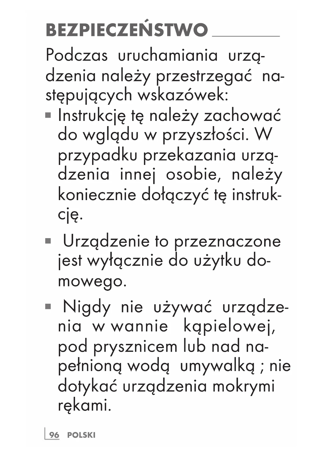 Nigdy nie używać urządze- nia w wannie kąpielowej, pod prysznicem lub nad na- pełnioną wodą umywalką ; nie dotykać urządzenia mokrymi rękami.97 POLSKI