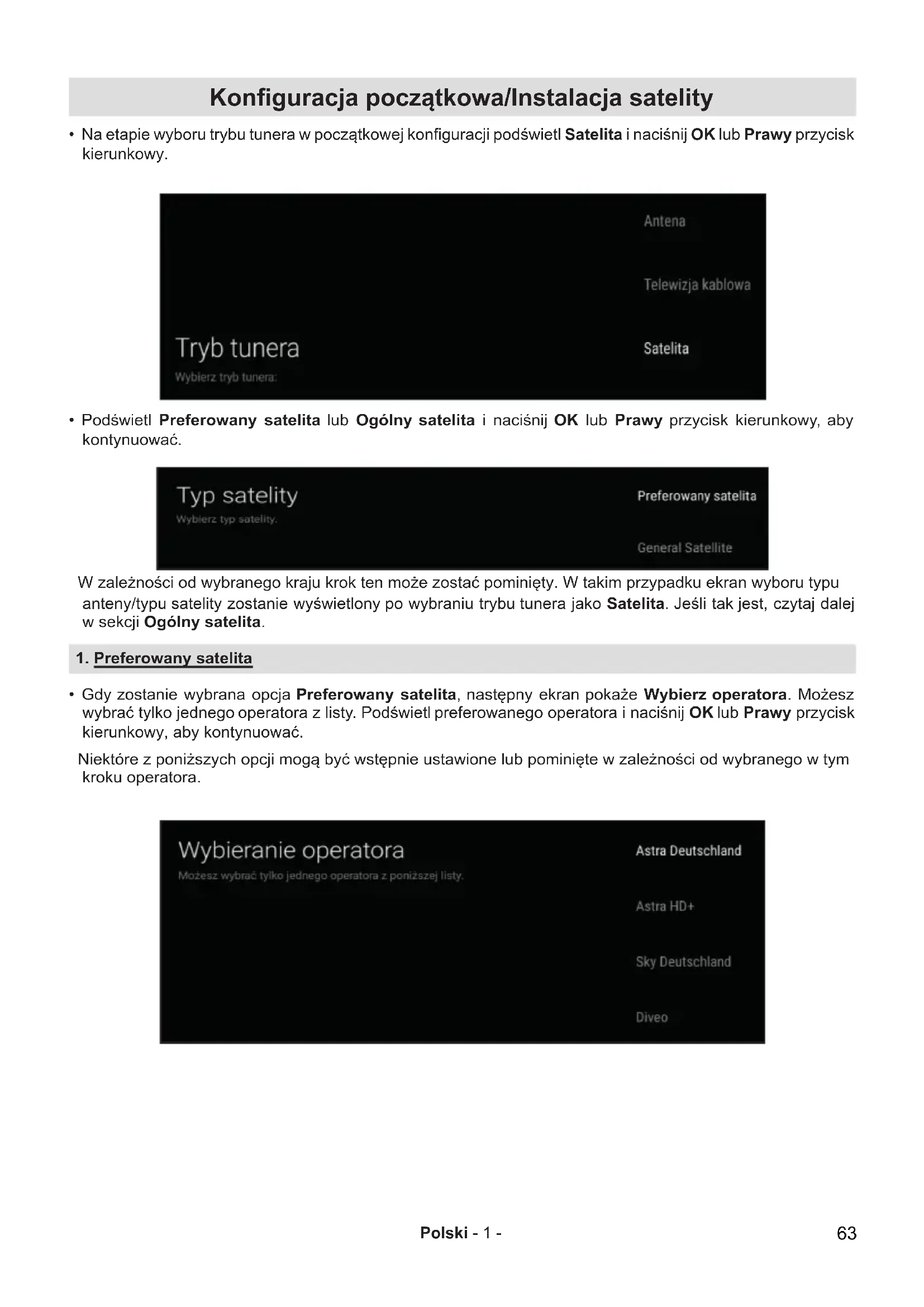 - Gdy zostanie wybrana opcja Preferowany satelita, następny ekran pokaże Wybierz operatora. Możesz wybrać tylko jednego operatora z listy. Podświetl preferowanego operatora i naciśnij OK lub Prawy przycisk kierunkowy, aby kontynuować. Niektóre z poniższych opcji mogą być wstępnie ustawione lub pominięte w zależności od wybranego w tym kroku operatora. 63Polski - 2 - 1.1. Typ anteny - Bezpośredni