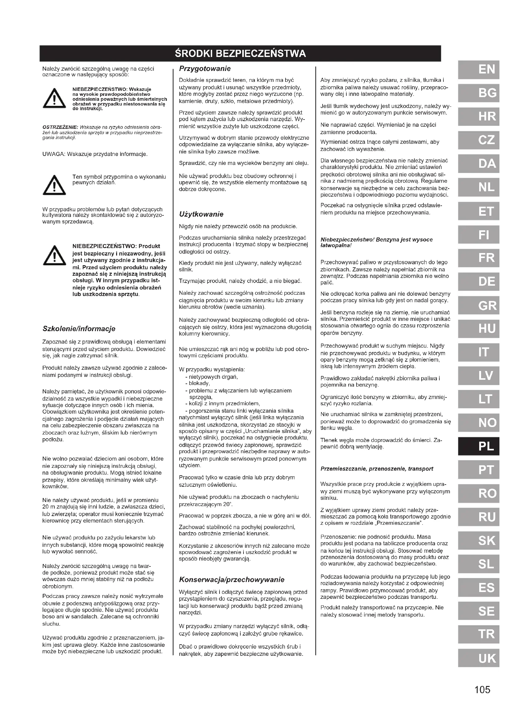 Przygotowanie Dokładnie sprawdzić teren, na którym ma być używany produkt i usunąć wszystkie przedmioty, które mogłyby zostać przez niego wyrzucone (np. kamienie, druty, szkło, metalowe przedmioty). Przed użyciem zawsze należy sprawdzić produkt pod kątem zużycia lub uszkodzenia narzędzi. Wy- mienić wszystkie zużyte lub uszkodzone części. Utrzymywać w dobrym stanie przewody elektryczne odpowiedzialne za wyłączanie silnika, aby wyłącze- nie silnika było zawsze możliwe. Sprawdzić, czy nie ma wycieków benzyny ani oleju. Nie używać produktu bez obudowy ochronnej i upewnić się, że wszystkie elementy montażowe są dobrze dokręcone. Użytkowanie Nigdy nie należy przewozić osób na produkcie. Podczas uruchamiania silnika należy przestrzegać instrukcji producenta i trzymać stopy w bezpiecznej odległości od ostrzy. Kiedy produkt nie jest używany, należy wyłączać silnik. Trzymając produkt, należy chodzić, a nie biegać. Należy zachować szczególną ostrożność podczas ciągnięcia produktu w swoim kierunku lub zmiany kierunku obrotów (wedle uznania). Należy zachowywać bezpieczną odległość od obra- cających się ostrzy, która jest wyznaczona długością kolumny kierownicy. Nie umieszczać rąk ani nóg w pobliżu lub pod obro- towymi częściami produktu. W przypadku wystąpienia: - nietypowych drgań, - blokady, - problemu z włączaniem lub wyłączaniem sprzęgła, - kolizji z innym przedmiotem, - pogorszenia stanu linki wyłączania silnika natychmiast wyłączyć silnik (jeśli linka wyłączania silnika jest uszkodzona, skorzystać ze stacyjki w sposób opisany w części „Uruchamianie silnika”, aby wyłączyć silnik), poczekać na ostygnięcie produktu, odłączyć przewód świecy zapłonowej, sprawdzić produkt i przeprowadzić niezbędne naprawy w auto- ryzowanym punkcie serwisowym przed ponownym użyciem. Pracować tylko w czasie dnia lub przy dobrym sztucznym oświetleniu. Nie używać produktu na zboczach o nachyleniu przekraczającym 20°. Pracować w poprzek zbocza, a nie w górę ani w dół. Zachować stabilność na pochyłej powierzchni, bardzo ostrożnie zmieniać kierunek. Korzystanie z akcesoriów innych niż zalecane może spowodować zagrożenie i uszkodzić produkt w sposób nieobjęty gwarancją. Konserwacja/przechowywanie Wyłączyć silnik i odłączyć świecę zapłonową przed przystąpieniem do czyszczenia, przeglądu, regu- lacji lub konserwacji produktu bądź przed zmianą narzędzi. W przypadku zmiany narzędzi wyłączyć silnik, odłą- czyć świecę zapłonową i założyć grube rękawice. Dbać o prawidłowe dokręcenie wszystkich śrub i nakrętek, aby zapewnić bezpieczne użytkowanie. Aby zmniejszyć ryzyko pożaru, z silnika, tłumika i zbiornika paliwa należy usuwać rośliny, przepraco- wany olej i inne łatwopalne materiały. Jeśli tłumik wydechowy jest uszkodzony, należy wy- mienić go w autoryzowanym punkcie serwisowym. Nie naprawiać części. Wymieniać je na części zamienne producenta. Wymieniać ostrza tnące całymi zestawami, aby zachować ich wyważenie. Dla własnego bezpieczeństwa nie należy zmieniać charakterystyki produktu. Nie zmieniać ustawień prędkości obrotowej silnika ani nie obsługiwać sil- nika z nadmierną prędkością obrotową. Regularne konserwacje są niezbędne w celu zachowania bez- pieczeństwa i odpowiedniego poziomu wydajności. Poczekać na ostygnięcie silnika przed odstawie- niem produktu na miejsce przechowywania. Niebezpieczeństwo! Benzyna jest wysoce łatwopalna! Przechowywać paliwo w przystosowanych do tego zbiornikach. Zawsze należy napełniać zbiornik na zewnątrz. Podczas napełniania zbiornika nie wolno palić. Nie odkręcać korka paliwa ani nie dolewać benzyny podczas pracy silnika lub gdy jest on nadal gorący. Jeśli benzyna rozleje się na ziemię, nie uruchamiać silnika. Przemieścić produkt w inne miejsce i unikać stosowania otwartego ognia do czasu rozproszenia oparów benzyny. Przechowywać produkt w suchym miejscu. Nigdy nie przechowywać produktu w budynku, w którym opary benzyny mogą zetknąć się z płomieniem, iskrą lub intensywnym źródłem ciepła. Prawidłowo zakładać nakrętki zbiornika paliwa i pojemnika na benzynę. Ograniczyć ilość benzyny w zbiorniku, aby zmniej- szyć ryzyko rozlania. Nie uruchamiać silnika w zamkniętej przestrzeni, ponieważ może to doprowadzić do gromadzenia się tlenku węgla. Tlenek węgla może doprowadzić do śmierci. Za- pewnić dobrą wentylację. Przemieszczanie, przenoszenie, transport Wszystkie prace przy produkcie z wyjątkiem upra- wy ziemi muszą być wykonywane przy wyłączonym silniku. Z wyjątkiem uprawy ziemi produkt należy prze- mieszczać za pomocą koła transportowego zgodnie z opisem w rozdziale „Przemieszczanie”. Przenoszenie: nie podnosić produktu. Masa produktu jest podana na tabliczce producenta oraz na końcu tej instrukcji obsługi. Stosować metodę przenoszenia dostosowaną do masy produktu oraz do warunków, aby zachować bezpieczeństwo. Podczas ładowania produktu na przyczepę lub jego rozładowywania należy korzystać z odpowiedniej rampy. Prawidłowo przymocować produkt, aby zapewnić bezpieczeństwo podczas transportu. Produkt należy transportować na przyczepie. Nie należy stosować innej metody transportu.106