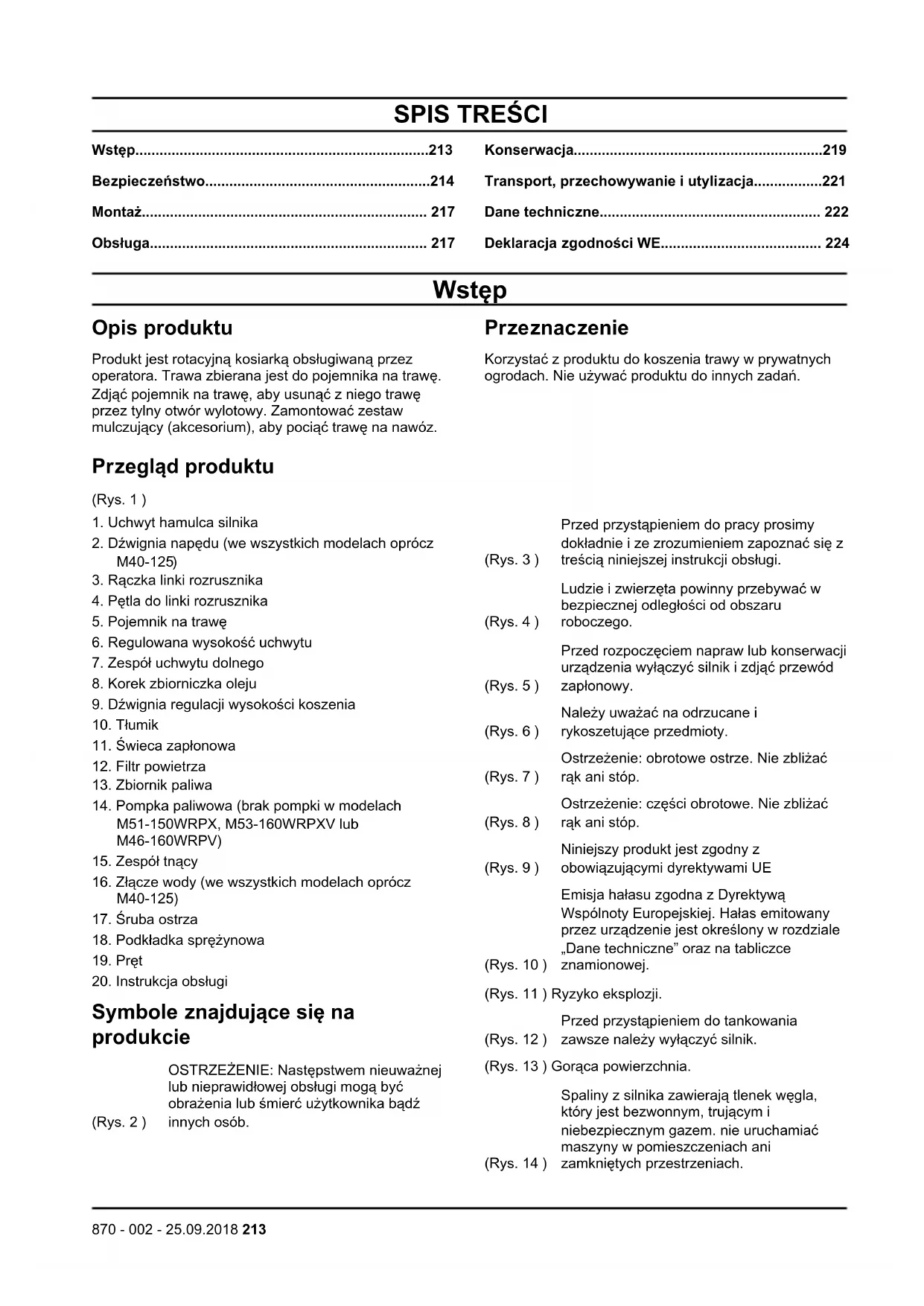 Symbole znajdujące się na produkcie (Rys. 2 ) OSTRZEŻENIE: Następstwem nieuważnej lub nieprawidłowej obsługi mogą być obrażenia lub śmierć użytkownika bądź innych osób. (Rys. 3 ) Przed przystąpieniem do pracy prosimy dokładnie i ze zrozumieniem zapoznać się z treścią niniejszej instrukcji obsługi. (Rys. 4 ) Ludzie i zwierzęta powinny przebywać w bezpiecznej odległości od obszaru roboczego. (Rys. 5 ) Przed rozpoczęciem napraw lub konserwacji urządzenia wyłączyć silnik i zdjąć przewód zapłonowy. (Rys. 6 ) Należy uważać na odrzucane i rykoszetujące przedmioty. (Rys. 7 ) Ostrzeżenie: obrotowe ostrze. Nie zbliżać rąk ani stóp. (Rys. 8 ) Ostrzeżenie: części obrotowe. Nie zbliżać rąk ani stóp. (Rys. 9 ) Niniejszy produkt jest zgodny z obowiązującymi dyrektywami UE (Rys. 10 ) Emisja hałasu zgodna z Dyrektywą Wspólnoty Europejskiej. Hałas emitowany przez urządzenie jest określony w rozdziale „Dane techniczne” oraz na tabliczce znamionowej. (Rys. 11 ) Ryzyko eksplozji. (Rys. 12 ) Przed przystąpieniem do tankowania zawsze należy wyłączyć silnik. (Rys. 13 ) Gorąca powierzchnia. (Rys. 14 ) Spaliny z silnika zawierają tlenek węgla, który jest bezwonnym, trującym i niebezpiecznym gazem. nie uruchamiać maszyny w pomieszczeniach ani zamkniętych przestrzeniach.