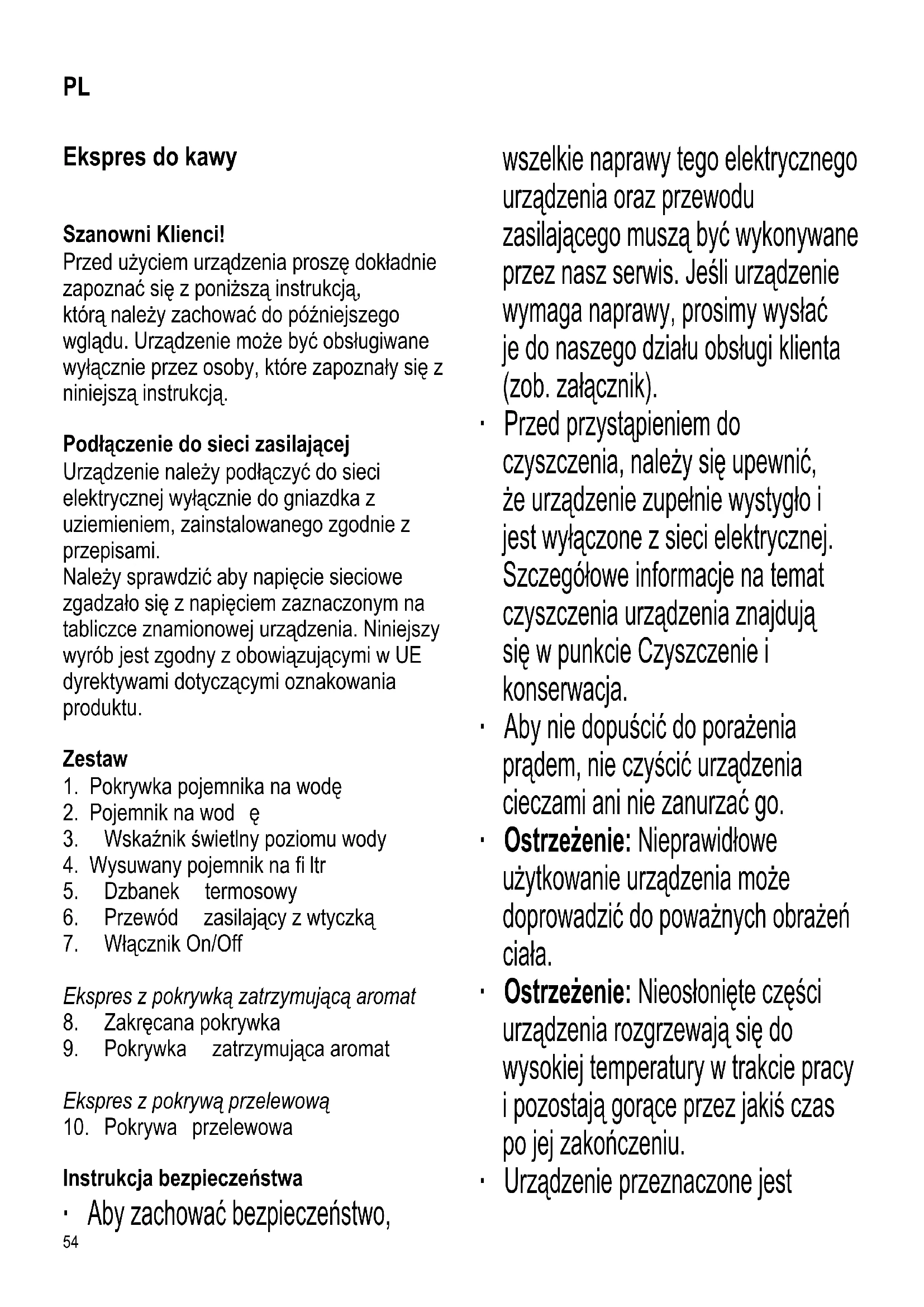 żytkowanie urządzenia może doprowadzić do poważnych obrażeń ciała. ∙ Ostrzeżenie: Nieosłonięte części urządzenia rozgrzewają się do wysokiej temperatury w trakcie pracy i pozostają gorące przez jakiś czas po jej zakończeniu. ∙ Urządzenie przeznaczone jest PL55 do zastosowań domowych lub podobnych, jak np. w - kuchniach biurowych lub innych miejscach pracy; - agroturystyce; - hotelach, motelach itp. oraz innych podobnych lokalach (przez klientów); - pensjonatach. ∙ Osoby o ograniczonych zdolnościach fi zycznych, czuciowych lub psychicznych albo nieposiadające stosownego doświadczenia lub wiedzy, a także dzieci (w wieku co najmniej 8 lat), mogą korzystać z urządzenia, pod warunkiem że znajdują się pod nadzorem lub zostały poinstruowane, jak używać urządzenia i są w pełni świadome wszelkich zagrożeń i wymaganych środków ostrożności. ∙ Nie dopuszczać do używania urządzenia jako zabawki przez dzieci. ∙ Nie wolno pozwalać dzieciom na wykonywanie jakichkolwiek prac związanych bezpośrednio z konserwacją lub czyszczeniem urz ądzenia, a jeżeli już, to dziecko musi mieć co najmniej 8 lat i być nadzorowane przez osobę dorosłą. ∙ Nie dopuszczać do urządzenia i jego przewodu zasilającego dzieci poniżej 8 lat. ∙ Ostrzeżenie: Nie pozwalać, aby dzieci miały dostęp do elementów opakowania, ponieważ mogą one spowodować zagrożenie, np. uduszenia. ∙ Przed użyciem należy dokładnie sprawdzić, czy główny korpus urządzenia i wszystkie elementy czynnościowe są sprawne i nie noszą śladów uszkodzenia. Jeżeli urządzenie np. spadło na twardą powierzchnię albo przewód zasilający został narażony na zbyt silne szarpnięcie, nie nadaje się ono do dalszego użytku: nawet najmniejsza, niewidoczna usterka powstała z tego powodu, może mieć ujemny wpływ na działanie urządzenia i bezpieczeństwo użytkownika. ∙ Podczas parzenia kawy, urządzenie musi być ustawione na równej i nie śliskiej powierzchni, odpornej na ewentualne zaplamienie i rozpryski. ∙ Urządzenie oraz przewód sieciowy nie mogą stykać się z gorącymi powierzchniami, ani też być poddawane działaniu wysokich temperatur. ∙ Przed otwieraniem ekspresu lub wyjmowaniem z niego jakichkolwiek elementów czynnościowych i akcesoriów, należy urządzenia wyłączyć i poczekać na jego ochłodzenie. W ten sposób można zapobiec niebezpieczeństwu wydzielania się pary lub gorącej wody. ∙ Dzieci powinny znajdować się pod stałą opieką, aby nie dopuścić do używania56 przez nie urządzenia jako zabawki. ∙ Należy wyjąć wtyczkę z gniazdka elektrycznego: - w przypadku wadliwej pracy urządzenia, - podczas czyszczenia, - jeżeli ekspres nie będzie przez dłuższy czas używany. ∙ Nigdy nie należy ciągnąć za przewód przy wyjmowaniu wtyczki z gniazdka elektrycznego. ∙ Przewód przyłączeniowy nie powinien zwisać wolno, należy uważać aby znajdował się w bezpiecznej odległości od gorących części urządzenia. ∙ Nie ponosi się odpowiedzialności, jeśli szkoda wynikła z nieprawidłowego używania sprzętu lub użytkowania niezgodnego z instrukcją obsługi. Automatyczny wyłącznik Aby niepotrzebnie nie zużywać energii, po zakończeniu cyklu parzenia urządzenie automatycznie się wyłączy. Przed użyciem ekspresu po raz pierwszy Przed użyciem ekspresu do kawy po raz pierwszy, należy urządzenie przepuścić przez proces „fi ltrowania bez kawy“ dwa albo trzy razy. Używamy w tym celu maksymalną ilość wody bez dodawania mielonej kawy. To samo „fi ltrowanie bez kawy“ należy przeprowadzać po dłuższym nieużywaniu ekspresu, oraz po usunięciu kamienia. Informacja ogólna ∙ Miarka na pojemniku na wodę służy do odmierzania prawidłowej ilości czystej wody w pojemniku na wodę. Przy podwójnej skali, lewa skala służy do mierzenia wody w regularnych fi liżankach o pojemności ok.125 ml, podczas gdy prawa skala służy do mierzenia wody w mniejszych fi liż ankach. Należy sprawdzić, że woda nie przekracza oznaczenia maksymalnego wypełnienia. ∙ Ostrzeżenie: Wylot gorącej wody jest połączony z pokrywką pojemnika. Nie należy próbować otwierać pokrywki podczas parzenia kawy: Grozi to oparzeniem. ∙ Jeżeli wymaganych jest kilka cykli parzenia kawy jeden po drugim, po każdym cyklu odczekać około 5 minut, aż ekspres nieco ostygnie. ∙ Ważna informacja: Przy napełnianiu ekspresu świeżą wodą, krótko po zakończeniu cyklu parzenia, istnieje niebezpieczeństwo poparzenia gorącą wodą lub ulatniającą się parą. Parzenie kawy ∙ Napełnianie wodą: Otworzyć pokrywkę pojemnika i wypełnić go odpowiednią ilością wody. ∙ Zakładanie papierowego fi ltra: Odchylić pojemnik na fi ltr w poziomie i włożyć fi ltr nr 4, zaginając najpierw perforowane brzegi fi ltra. ∙ Wsypywanie mielonej kawy : Na każdą standardową fi liżankę (125 ml) wymagane jest ok. 6 gramów (=1½ - 2 łyżeczki do herbaty) drobno zmielonej kawy. Następnie zamknąć pokrywkę pojemnika. ∙ U żywanie szklanego dzbanka: Należy założyć pokrywkę zatrzymującą aromat lub pokrywkę przelewową na dzbanek a następnie umieścić dzbanek w ekspresie. Jeśli dzbanek z pokrywką został poprawnie włożony, zawór zapobiegający kapaniu zostanie unieruchomiony na czas procesu parzenia. ∙ Rozpoczęcie procesu parzenia:57 Włożyć wtyczkę do odpowiedniego gniazdka i uruchomić urządzenie za pomocą włącznika On/Off. Rozpocznie się cykl fi ltracji wody przez fi ltr z kawą. ∙ Wyjmowanie szklanego dzbanka: Przed wyjęciem dzbanka, należy odczekać, aż woda całkowicie spłynie z fi ltra. Aby utrzymać dłużej wysoką temperaturę kawy, zdjąć pokrywkę zatrzymującą aromat i zamknąć dzbanek zakręcaną pokrywką. Nie jest to wymagane, jeżeli ekspres wyposażony jest w pokrywę przelewową, która może pozostać na dzbanku. Po zakończeniu procesu parzenia urządzenie wyłącz