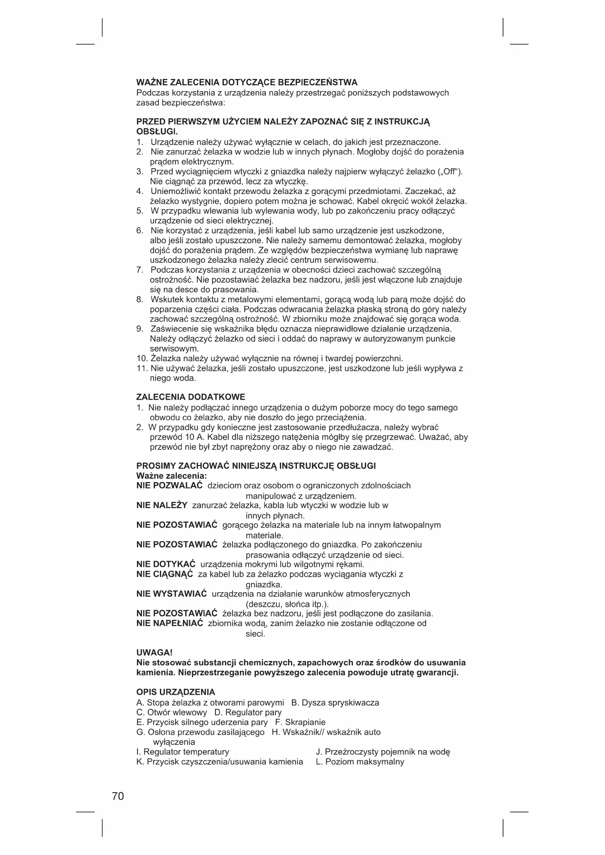 Ważne zalecenia: NIE POZWALAĆ dzieciom oraz osobom o ograniczonych zdolnościach manipulować z urządzeniem. NIE NALEŻY zanurzać żelazka, kabla lub wtyczki w wodzie lub w innych płynach. NIE POZOSTAWIAĆ gorącego żelazka na materiale lub na innym łatwopalnym materiale. NIE POZOSTAWIAĆ żelazka podłączonego do gniazdka. Po zakończeniu prasowania odłączyć urządzenie od sieci. NIE DOTYKAĆ urządzenia mokrymi lub wilgotnymi rękami. NIE CIĄGNĄĆ za kabel lub za żelazko podczas wyciągania wtyczki z gniazdka. NIE WYSTAWIAĆ urządzenia na działanie warunków atmosferycznych (deszczu, słońca itp.). NIE POZOSTAWIAĆ żelazka bez nadzoru, jeśli jest podłączone do zasilania. NIE NAPEŁNIAĆ zbiornika wodą, zanim żelazko nie zostanie odłączone od sieci. UWAGA! Nie stosować substancji chemicznych, zapachowych oraz środków do usuwania kamienia. Nieprzestrzeganie powyższego zalecenia powoduje utratę gwarancji.