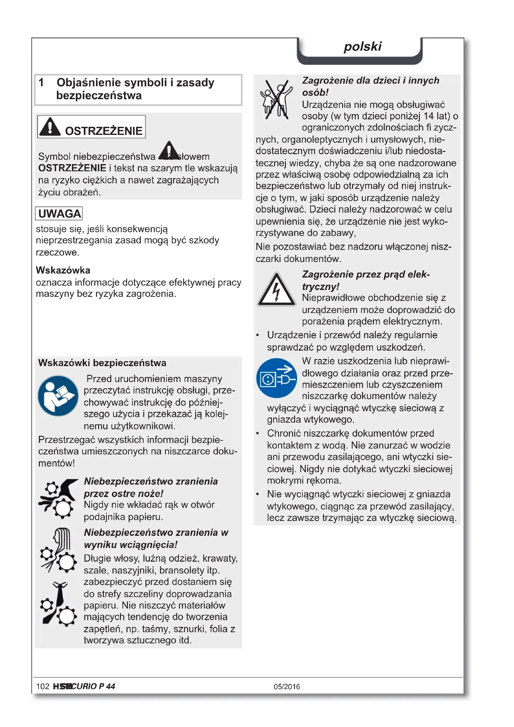 - Antall ark (DIN A4, 70 g/m² hhv. 80 g/m²) i tilførselen som skjæres i én omgang. Den angitte ytelsen er fastsatt basert på et nytt, oljet skjæreverk og kald motor. Svakere linjespenning eller frekvens kan gi lavere ytelse og økt driftsstøy. Avhengig av papirets struktur og egenskaper og type innmating, kan arkytelsen avvike.102 SECURIO P 44 05/2016 polski 1 Objaśnienie symboli i zasady bezpieczeństwa Wskazówka oznacza informacje dotyczące efektywnej pracy maszyny bez ryzyka zagrożenia. OSTRZEŻENIE Symbol niebezpieczeństwa ze słowem OSTRZEŻENIE i tekst na szarym tle wskazują na ryzyko ciężkich a nawet zagrażających życiu obrażeń. Wskazówki bezpieczeństwa Przed uruchomieniem maszyny przeczytać instrukcję obsługi, prze- chowywać instrukcję do później- szego użycia i przekazać ją kolej- nemu użytkownikowi. Przestrzegać wszystkich informacji bezpie- czeństwa umieszczonych na niszczarce doku- mentów! Niebezpieczeństwo zranienia przez ostre noże! Nigdy nie wkładać rąk w otwór podajnika papieru. Niebezpieczeństwo zranienia w wyniku wciągnięcia! Długie włosy, luźną odzież, krawaty, szale, naszyjniki, bransolety itp. zabezpieczyć przed dostaniem się do strefy szczeliny doprowadzania papieru. Nie niszczyć materiałów mających tendencję do tworzenia zapętleń, np. taśmy, sznurki, folia z tworzywa sztucznego itd. Zagrożenie dla dzieci i innych osób! Urządzenia nie mogą obsługiwać osoby (w tym dzieci poniżej 14 lat) o ograniczonych zdolnościach fi zycz- nych, organoleptycznych i umysłowych, nie- dostatecznym doświadczeniu i/lub niedosta- tecznej wiedzy, chyba że są one nadzorowane przez właściwą osobę odpowiedzialną za ich bezpieczeństwo lub otrzymały od niej instruk- cje o tym, w jaki sposób urządzenie należy obsługiwać. Dzieci należy nadzorować w celu upewnienia się, że urządzenie nie jest wyko- rzystywane do zabawy, Nie pozostawiać bez nadzoru włączonej nisz- czarki dokumentów. Zagrożenie przez prąd elek- tryczny! Nieprawidłowe obchodzenie się z urządzeniem może doprowadzić do porażenia prądem elektrycznym.