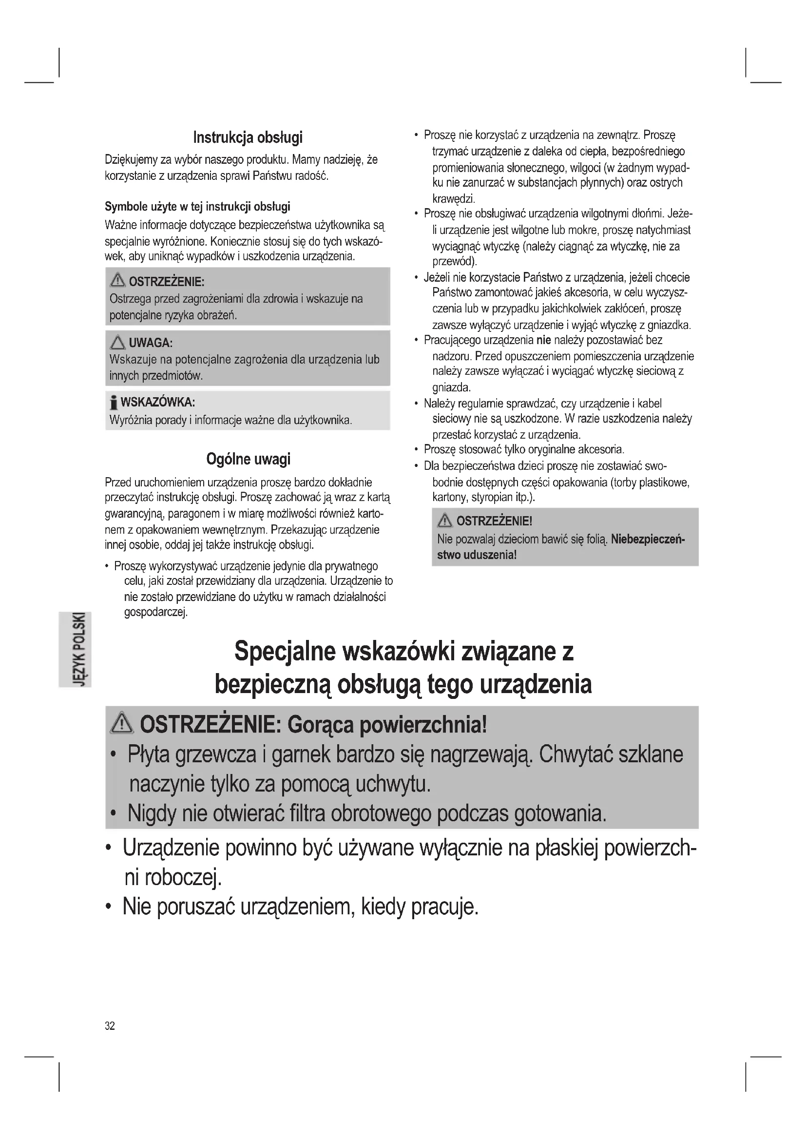 - Proszę wykorzystywać urządzenie jedynie dla prywatnego celu, jaki został przewidziany dla urządzenia. Urządzenie to nie zostało przewidziane do użytku w ramach działalności gospodarczej. Specjalne wskazówki związane z bezpieczną obsługą tego urządzenia OSTRZEŻENIE: Gorąca powierzchnia!