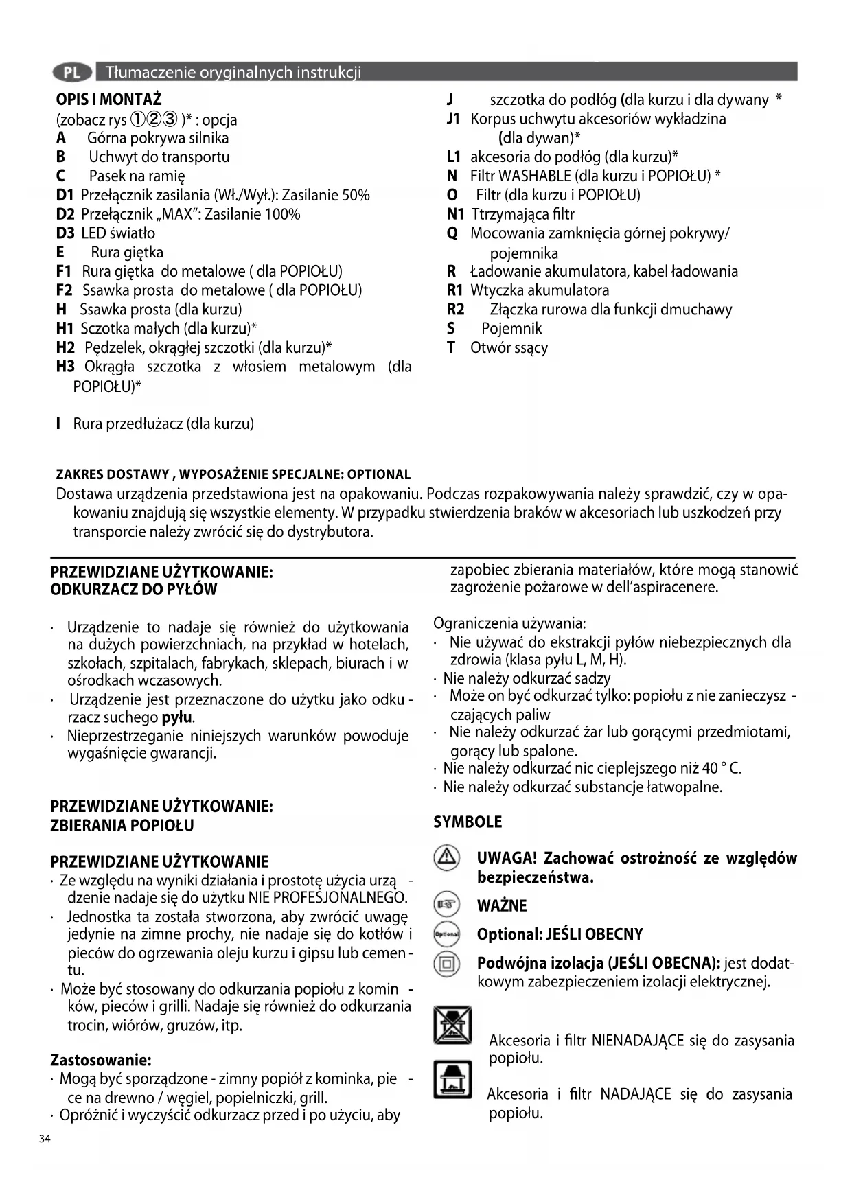 - Nie należy odkurzać substancje łatwopalne. SYMBOLE UWAGA! Zachować ostrożność ze względów bezpieczeństwa. WAŻNE Optional: JEŚLI OBECNY Podwójna izolacja (JEŚLI OBECNA): jest dodat- kowym zabezpieczeniem izolacji elektrycznej. Akcesoria i filtr NIENADAJĄCE się do zasysania popiołu. Akcesoria i filtr NADAJĄCE się do zasysania popiołu. Tłumaczenie oryginalnych instrukcji Istruzioni originali