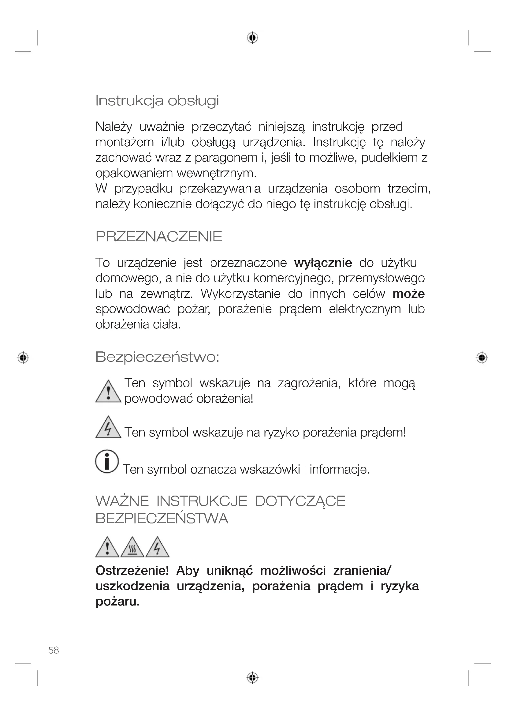 BEZPIECZEŃSTWA Ostrzeżenie! Aby uniknąć możliwości zranienia/ uszkodzenia urządzenia, porażenia prądem i ryzyka pożaru.POLSKI Instrukcja obsługi