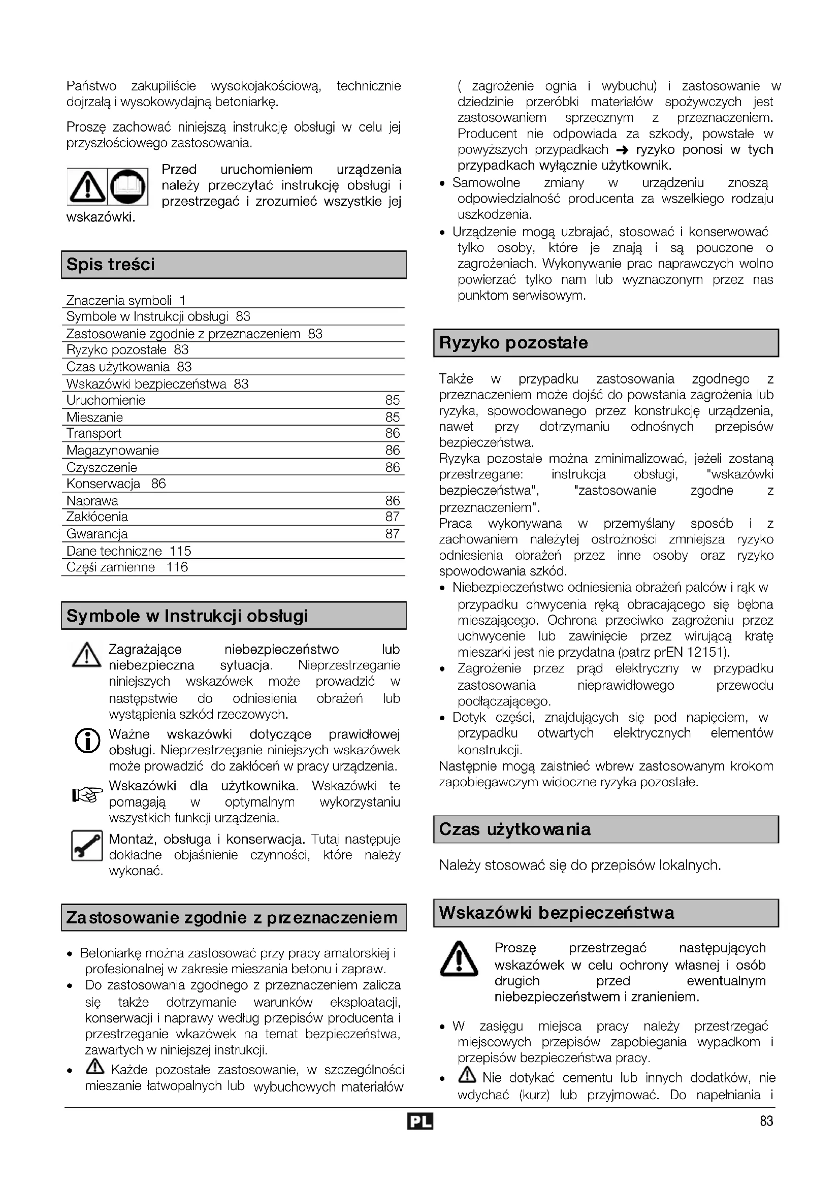 Spis treści Znaczenia symboli 1Symbole w Instrukcji obsługi 83Zastosowanie zgodnie z przeznaczeniem 83Ryzyko pozostałe 83Czas użytkowania 83Wskazówki bezpieczeństwa 83Uruchomienie 85Mieszanie 85Transport 86Magazynowanie 86Czyszczenie 86Konserwacja 86Naprawa 86Zakłócenia 87Gwarancja 87Dane techniczne 115Częśi zamienne 116