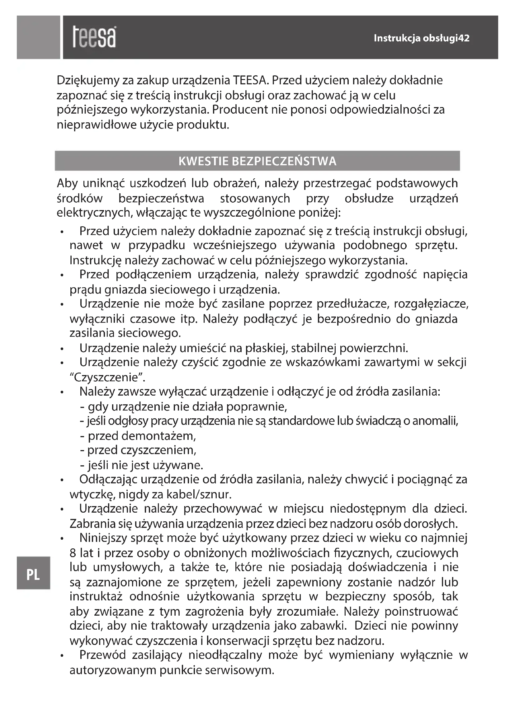 Dziekujemy za zakup urzadzenia TEESA. Przed uzyciem naleź doktadnie zapoznać są ztreście instrukcji obstugi oraz zachować są w celu poźniejskiego wykorzystania. Producent nie ponosi odpowiedzialnosci zaNieprawidowej uzycie produktu.