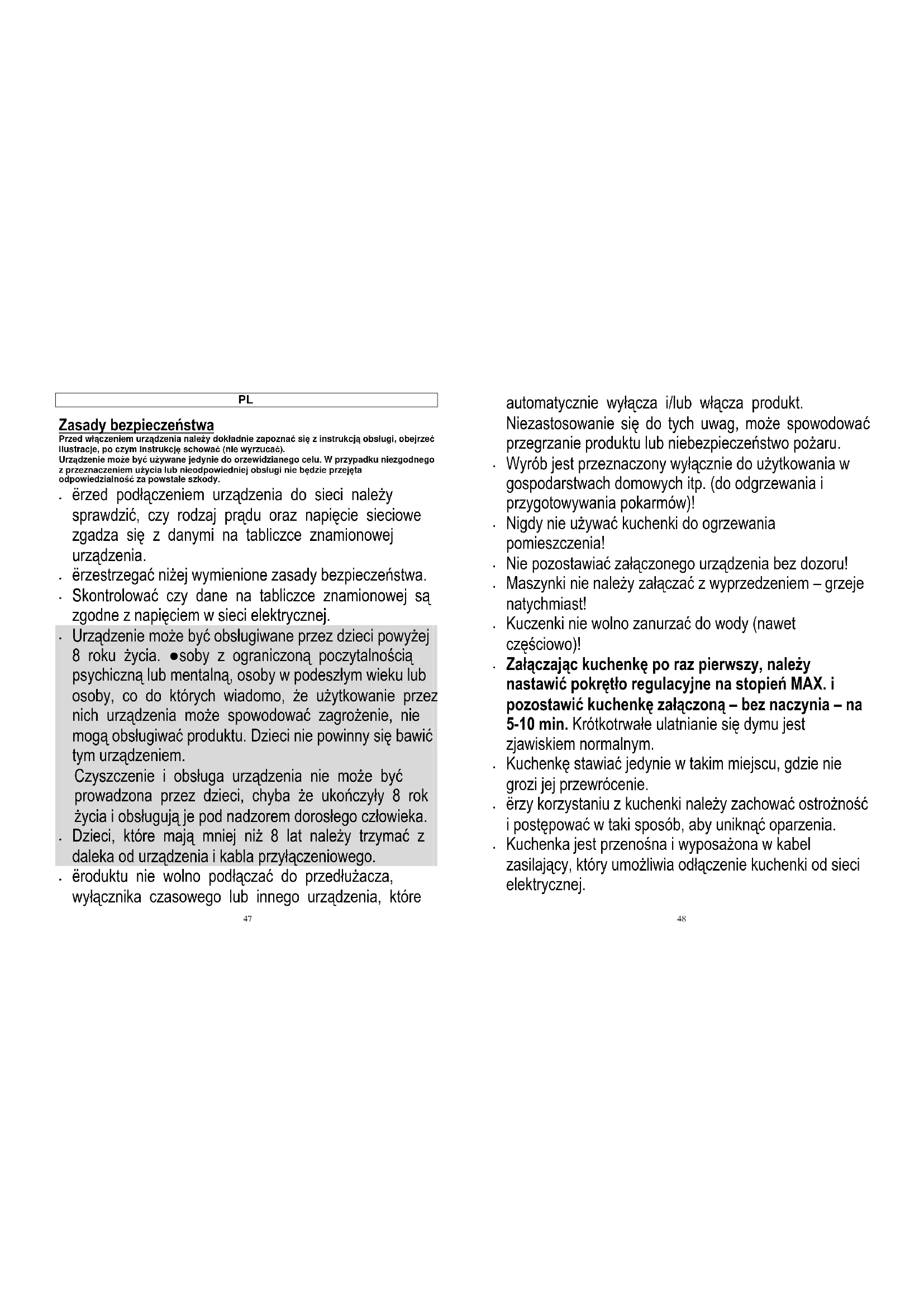 Urządzenie może być obsługiwane przez dzieci powyżej 8 roku życia. Osoby z ograniczoną poczytalnością psychiczną lub mentalną, osoby w podeszłym wieku lub osoby, co do których wiadomo, że użytkowanie przez nich urządzenia może spowodować zagrożenie, nie mogą obsługiwać produktu. Dzieci nie powinny się bawić tym urządzeniem. Czyszczenie i obsługa urządzenia nie może być prowadzona przez dzieci, chyba że ukończyły 8 rok życia i obsługują je pod nadzorem dorosłego człowieka.