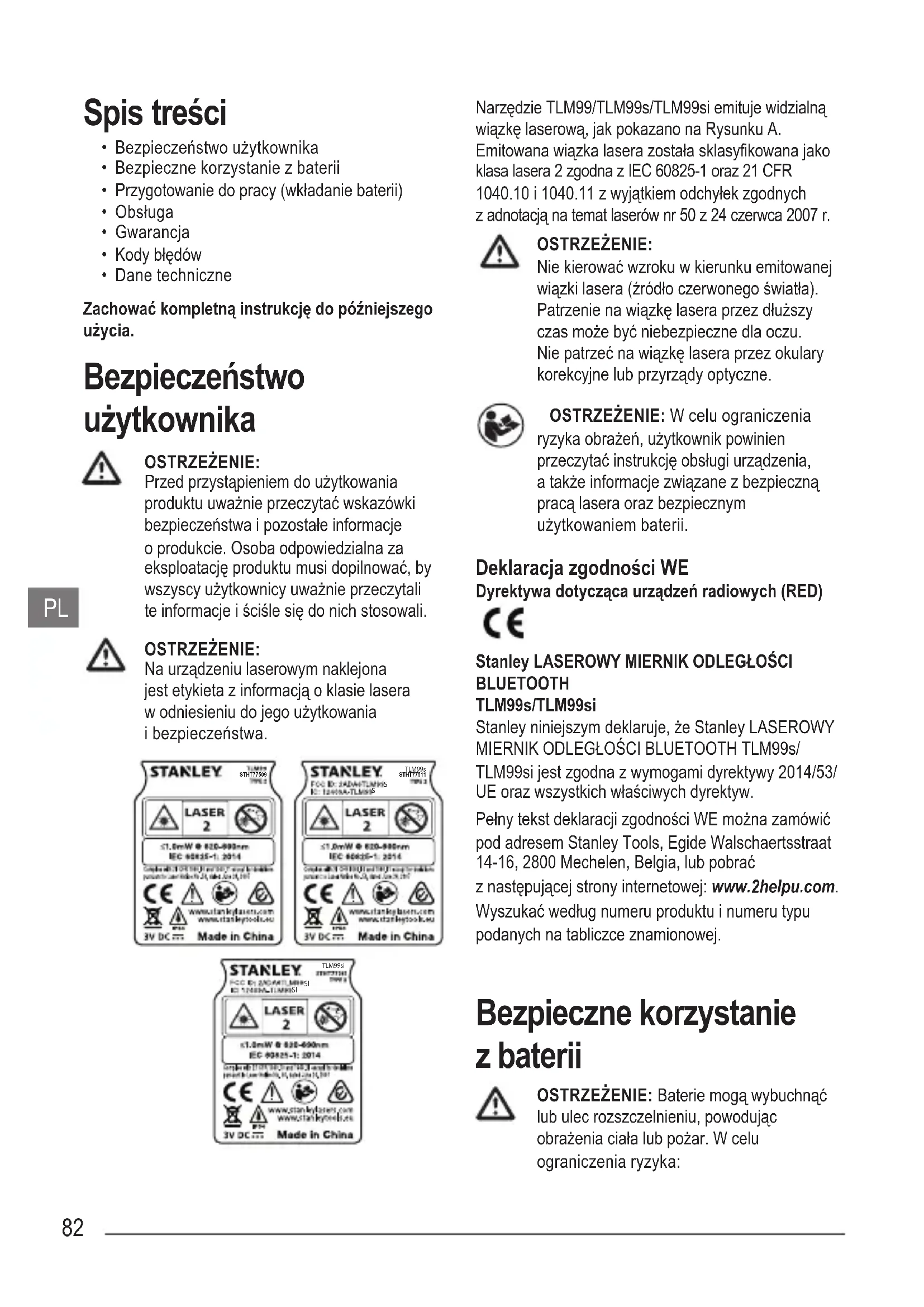 TLM99si Narzędzie TLM99/TLM99s/TLM99si emituje widzialną wiązkę laserową, jak pokazano na Rysunku A. Emitowana wiązka lasera została sklasyfikowana jako klasa lasera 2 zgodna z IEC 60825-1 oraz 21 CFR 1040.10 i 1040.11 z wyjątkiem odchyłek zgodnych z adnotacją na temat laserów nr 50 z 24 czerwca 2007 r.OSTRZEŻENIE:Nie kierować wzroku w kierunku emitowanej wiązki lasera (źródło czerwonego światła). Patrzenie na wiązkę lasera przez dłuższy czas może być niebezpieczne dla oczu. Nie patrzeć na wiązkę lasera przez okulary korekcyjne lub przyrządy optyczne. OSTRZEŻENIE: W celu ograniczenia ryzyka obrażeń, użytkownik powinien przeczytać instrukcję obsługi urządzenia, a także informacje związane z bezpieczną pracą lasera oraz bezpiecznym użytkowaniem baterii. Deklaracja zgodności WE Dyrektywa dotycząca urządzeń radiowych (RED)Stanley LASEROWY MIERNIK ODLEGŁOŚCI BLUETOOTHTLM99s/TLM99siStanley niniejszym deklaruje, że Stanley LASEROWY MIERNIK ODLEGŁOŚCI BLUETOOTH TLM99s/TLM99si jest zgodna z wymogami dyrektywy 2014/53/UE oraz wszystkich właściwych dyrektyw.Pełny tekst deklaracji zgodności WE można zamówić pod adresem Stanley Tools, Egide Walschaertsstraat 14-16, 2800 Mechelen, Belgia, lub pobrać z następującej strony internetowej: www.2helpu.com.Wyszukać według numeru produktu i numeru typu podanych na tabliczce znamionowej. Bezpieczne korzystanie z baterii OSTRZEŻENIE: Baterie mogą wybuchnąć lub ulec rozszczelnieniu, powodując obrażenia ciała lub pożar. W celu ograniczenia ryzyka:83