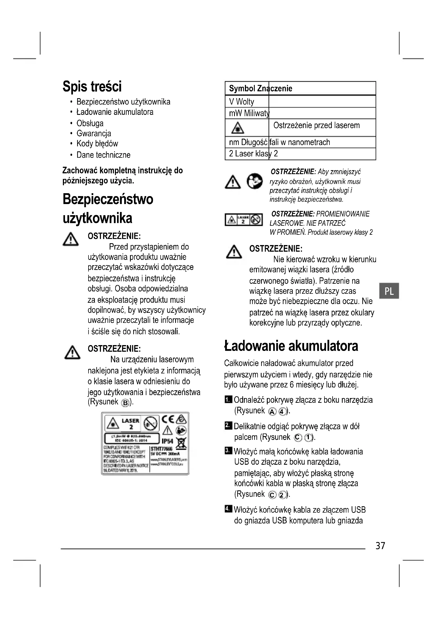 Symbol Znaczenie V Wolty mW Miliwaty Ostrzeżenie przed laserem nm Długość fali w nanometrach 2 Laser klasy 2 OSTRZEŻENIE: Aby zmniejszyć ryzyko obrażeń, użytkownik musi przeczytać instrukcję obsługi i instrukcję bezpieczeństwa.