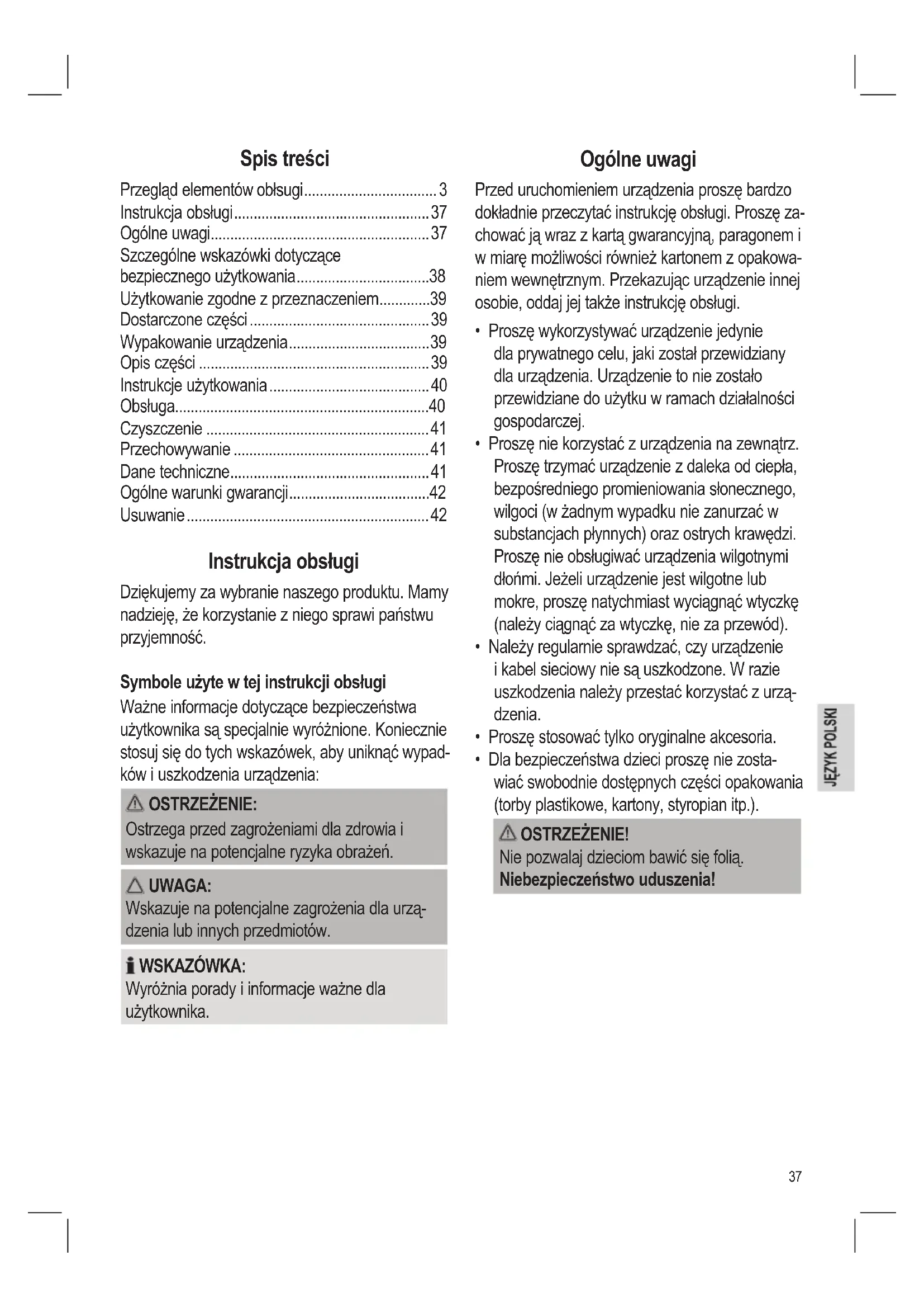 - Proszę wykorzystywać urządzenie jedynie dla prywatnego celu, jaki został przewidziany dla urządzenia. Urządzenie to nie zostało przewidziane do użytku w ramach działalności gospodarczej.