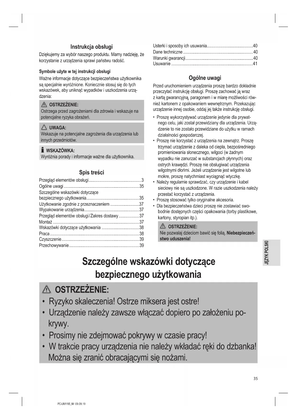 - W trakcie pracy urządzenia nie należy wkładać ręki do dzbanka! Można się zranić obracającymi się nożami.PC-UM1195_IM 09.09.19