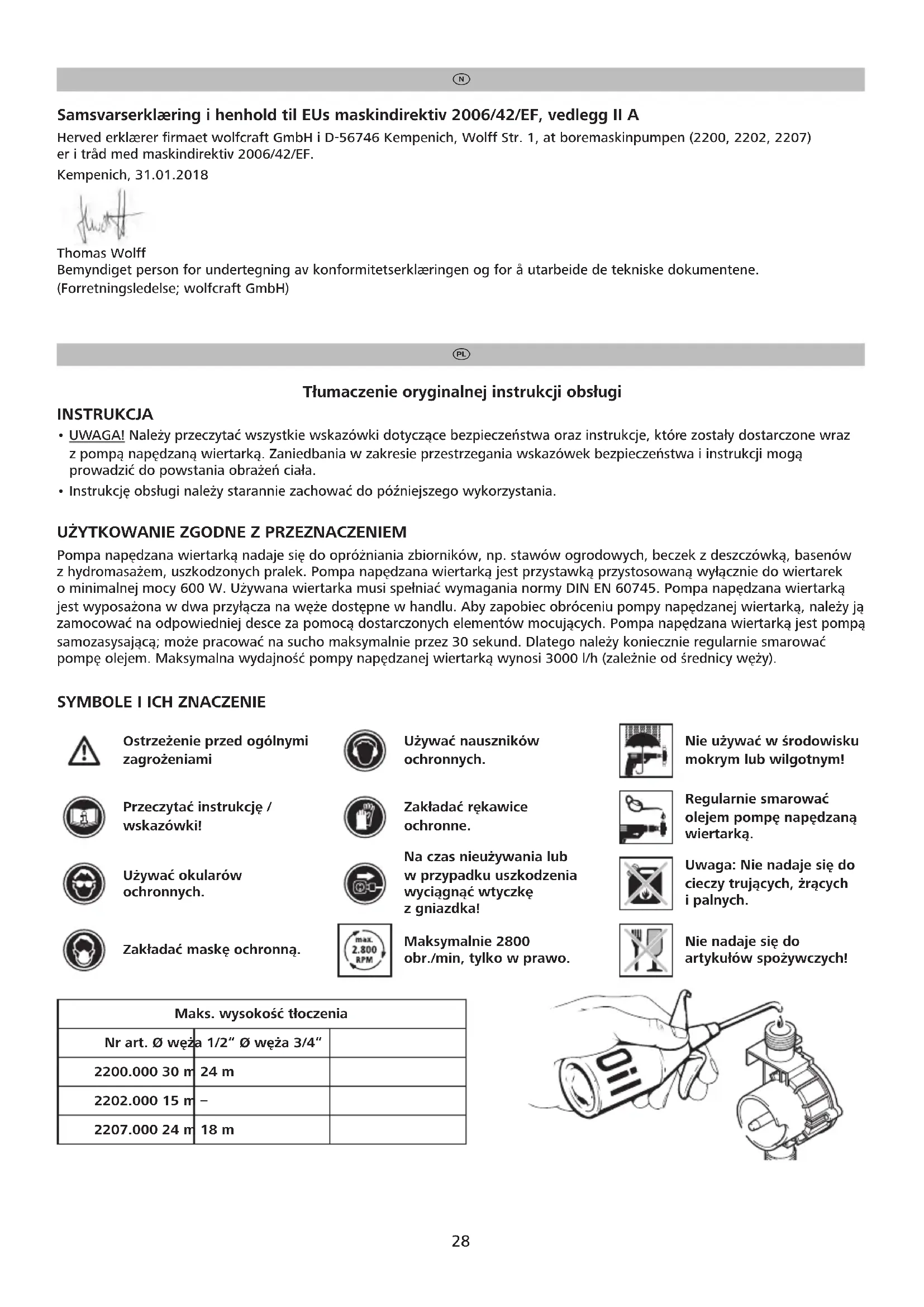 - Łożysko wirnika pompy należy regularnie smarować dostępnym w handlu olejem maszynowym. ŚRODOWISKO W przypadku utylizacji pompy napędzanej wiertarką należy bezwzględnie przestrzegać miejscowych przepisów dotyczących sposobu utylizacji odpadów. 29Oświadczenie gwarancyjne Drodzy majsterkowicze! Zakupiony przez Państwo produkt firmy wolfcraft jest wysokiej jakości i korzystanie z niego podczas domowych remontów będzie sprawiać wiele radości. Produkty firmy wolfcraft odpowiadają najostrzejszym normom technicznym i zanim trafią na rynek, przechodzą wiele złożonych etapów konstrukcyjnych i testowych. Stałe kontrole i regularne testy podczas produkcji seryjnej zapewniają wysoką jakość naszych urządzeń. Staranne opracowanie konstrukcji i niezawodne kontrole jakości dają pewność dokonania dobrego zakupu. Na zakupiony produkt firmy wolfcraft otrzymują Państwo 10-letnią gwarancję od daty zakupu pod warunkiem korzystania z urządzenia wyłącznie na potrzeby napraw domowych. Gwarancja obejmuje tylko szkody dotyczące samego przedmiotu zakupu i odnoszące się jedynie do wad materiału i błędów fabrycznych. Gwarancją nie są objęte usterki ani uszkodzenia wynikające z nieprawidłowej obsługi lub braku konserwacji produktu. Gwarancja nie obejmuje także zwykłych i wynikających z normalnego użytkowania oznak zużycia ani braków czy uszkodzeń, o których klient wiedział podczas zawierania transakcji. Roszczeń gwarancyjnych można dochodzić wyłącznie za okazaniem rachunku/dowodu zakupu. Przyznawana przez firmę wolfcraft gwarancja nie ogranicza praw kupującego jako konsumenta (do działań naprawczych, odstąpienia od zakupu lub obniżenia ceny kupna ze względu na wadę towaru, za którą odpowiada sprzedający, zwrotu nakładów czy odszkodowania). Roszczenia gwarancyjne należy kierować na adres: wolfcraft GmbH Wolffstraße 1 56746 Kempenich Niemcy Deklaracja zgodności według dyrektywy maszynowej WE, 2006/42/WE, załącznik II A Firma wolfcraft GmbH z siedzibą w Niemczech, 56746 Kempenich, Wolff Str. 1, niniejszym oświadcza, że pompa napędzana wiertarką (2200, 2202, 2207) spełnia wymagania dyrektywy maszynowej 2006/42/WE. Kempenich, 31.01.2018 Thomas Wolff Osoba upoważniona do podpisywania deklaracji zgodności i opracowania dokumentacji technicznej. (Zarząd; wolfcraft GmbH)