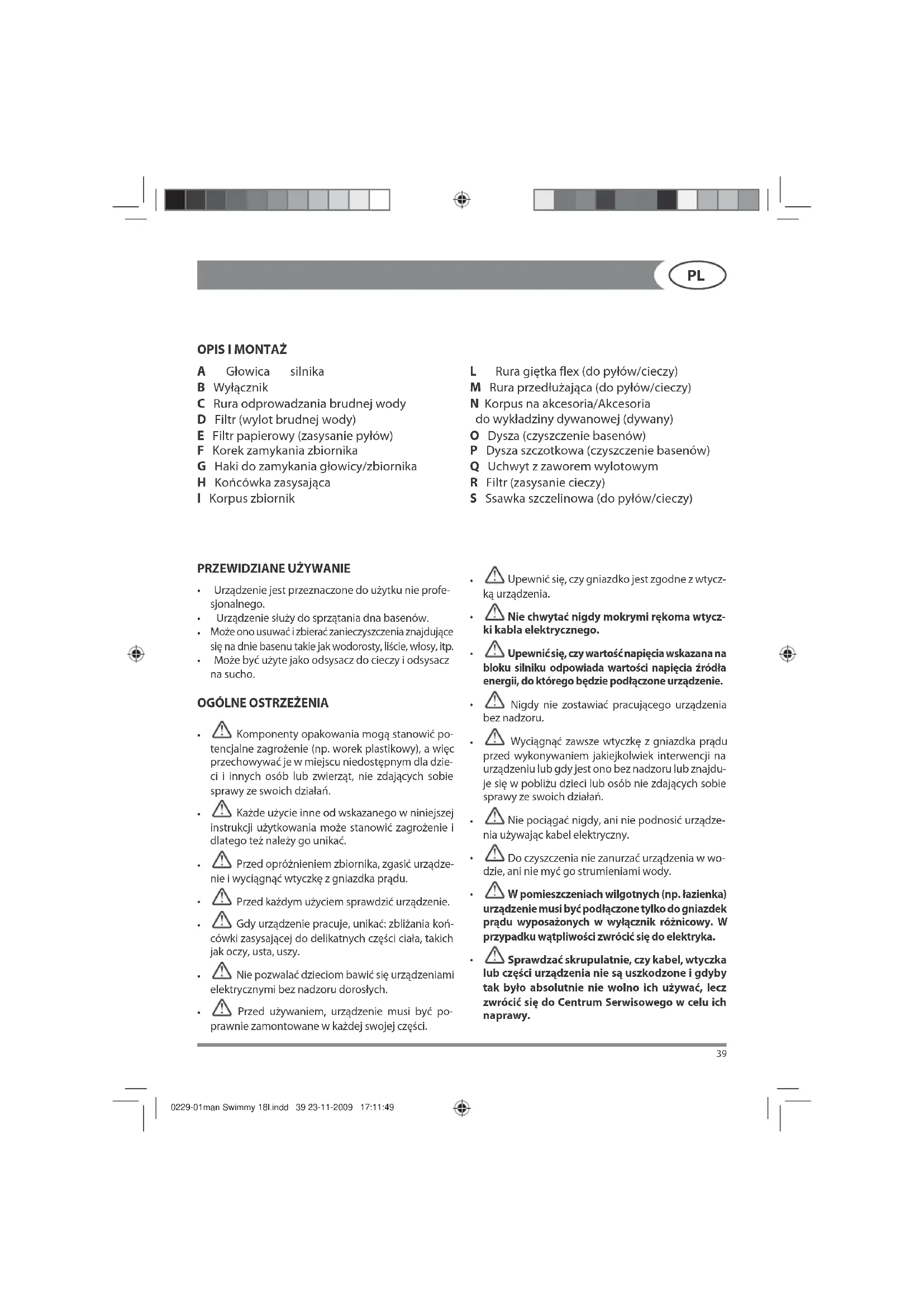 Sprawdzać skrupulatnie, czy kabel, wtyczka lub części urządzenia nie są uszkodzone i gdyby tak było absolutnie nie wolno ich używać, lecz zwrócić się do Centrum Serwisowego w celu ich naprawy. 0229-01man Swimmy 18l.indd 39 23-11-2009 17:11:49EN