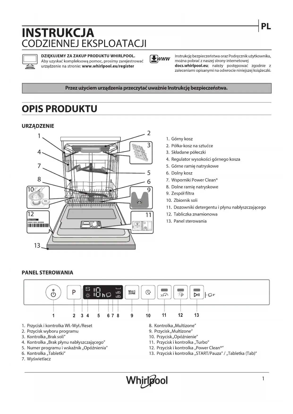 INSTRUKCJA CODZIENNEJ EKSPLOATACJI Przez użyciem urządzenia przeczytać uważnie Instrukcję bezpieczeństwa. URZĄDZENIE OPIS PRODUKTU PANEL STEROWANIA DZIĘKUJEMY ZA ZAKUP PRODUKTU WHIRLPOOL. Aby uzyskać kompleksową pomoc, prosimy zarejestrować urządzenie na stronie: www.whirlpool.eu/registerInstrukcję bezpieczeństwa oraz Podręcznik użytkownika, można pobrać z naszej strony internetowej docs.whirlpool.eu; należy postępować zgodnie z zaleceniami opisanymi na odwrocie niniejszej książeczki.1. Przycisk i kontrolka Wł.-Wył./Reset2. Przycisk wyboru programu3. Kontrolka „Brak soli”4. Kontrolka „Brak płynu nabłyszczającego”5. Numer programu i wskaźnik „Opóźnienia”6. Kontrolka „Tabletki”7. Wyświetlacz 8. Kontrolka „Multizone”9. Przycisk „Multizone”10. Przycisk „Opóźnienie”11. Przycisk i kontrolka „Turbo”12. Przycisk i kontrolka „Power Clean®”13. Przycisk i kontrolka „START/Pauza” / „Tabletka (Tab)”1. Górny kosz2. Półka-kosz na sztućce3. Składane półeczki4. Regulator wysokości górnego kosza5. Górne ramię natryskowe6. Dolny kosz7. Wsporniki Power Clean®8. Dolne ramię natryskowe9. Zespół ltra10. Zbiornik soli11. Dozowniki detergentu i płynu nabłyszczającego12. Tabliczka znamionowa13. Panel sterowania0000 000 00000 Service: