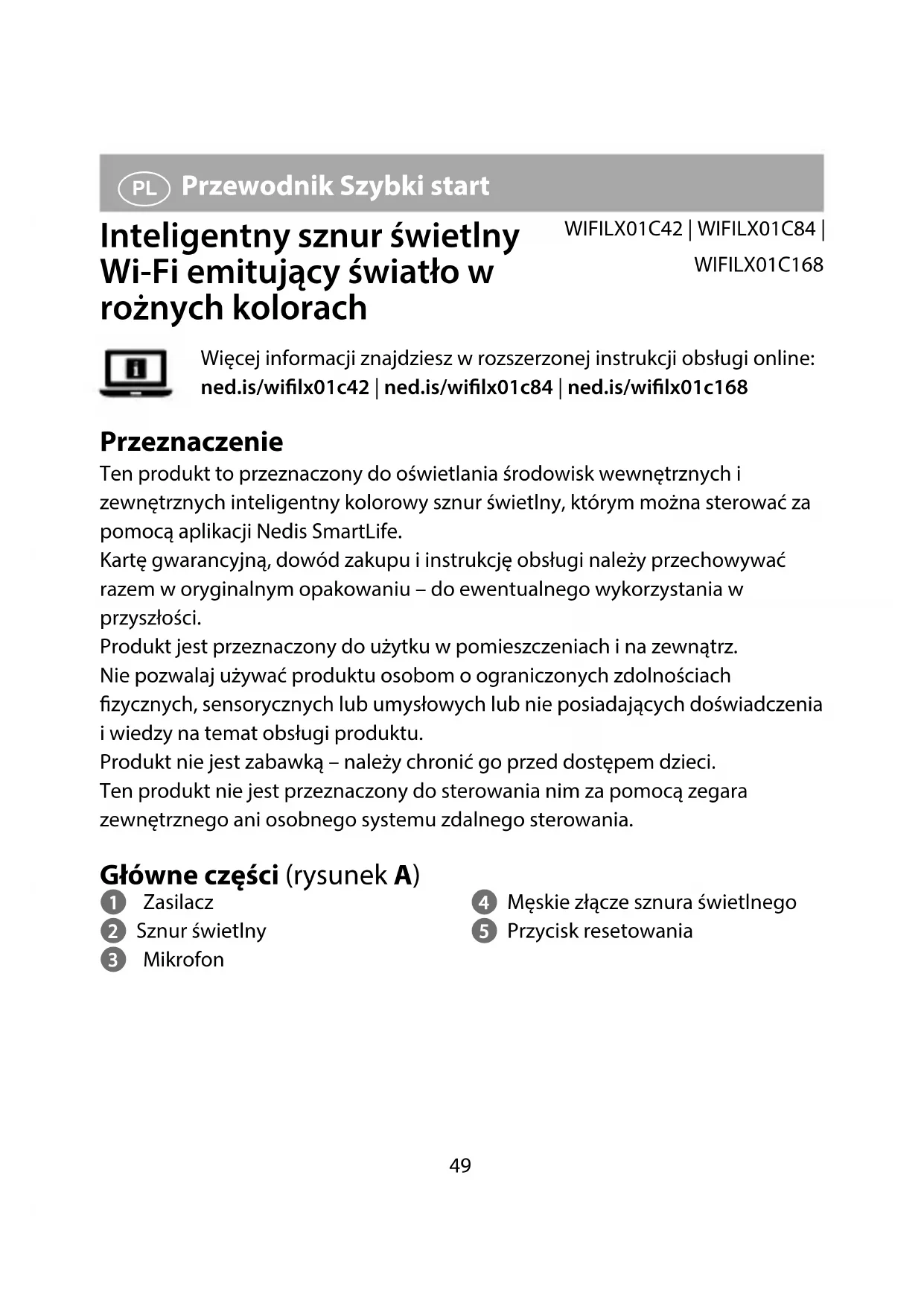 WIFILX01C168 Więcej informacji znajdziesz w rozszerzonej instrukcji obsługi online: ned.is/wilx01c42 | ned.is/wilx01c84 | ned.is/wilx01c168 Przeznaczenie Ten produkt to przeznaczony do oświetlania środowisk wewnętrznych i zewnętrznych inteligentny kolorowy sznur świetlny, którym można sterować za pomocą aplikacji Nedis SmartLife. Kartę gwarancyjną, dowód zakupu i instrukcję obsługi należy przechowywać razem w oryginalnym opakowaniu – do ewentualnego wykorzystania w przyszłości. Produkt jest przeznaczony do użytku w pomieszczeniach i na zewnątrz. Nie pozwalaj używać produktu osobom o ograniczonych zdolnościach zycznych, sensorycznych lub umysłowych lub nie posiadających doświadczenia i wiedzy na temat obsługi produktu. Produkt nie jest zabawką – należy chronić go przed dostępem dzieci. Ten produkt nie jest przeznaczony do sterowania nim za pomocą zegara zewnętrznego ani osobnego systemu zdalnego sterowania. Główne części (rysunek A) 1 Zasilacz 2 Sznur świetlny 3 Mikrofon 4 Męskie złącze sznura świetlnego 5 Przycisk resetowania50 Instrukcje bezpieczeństwa